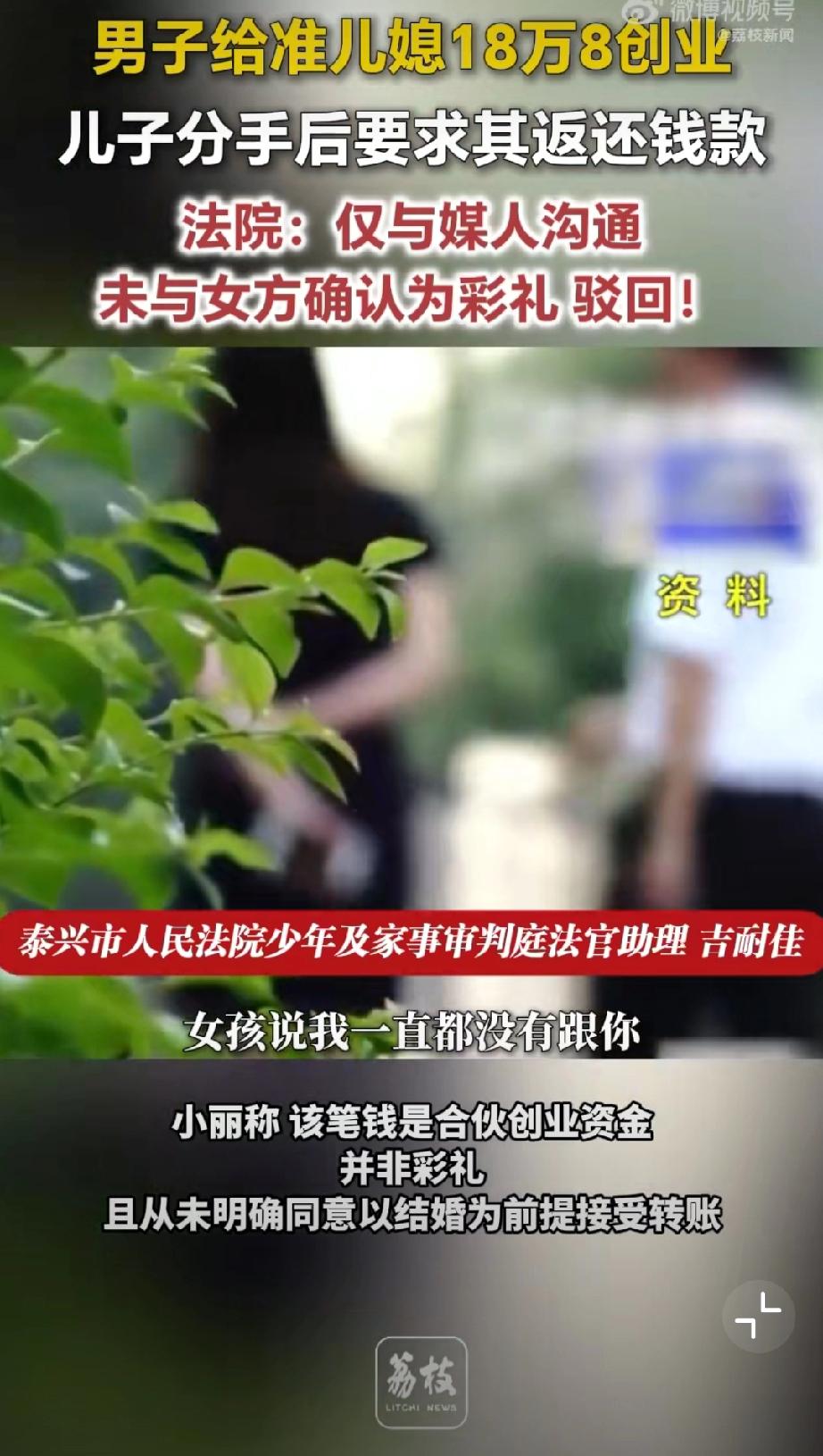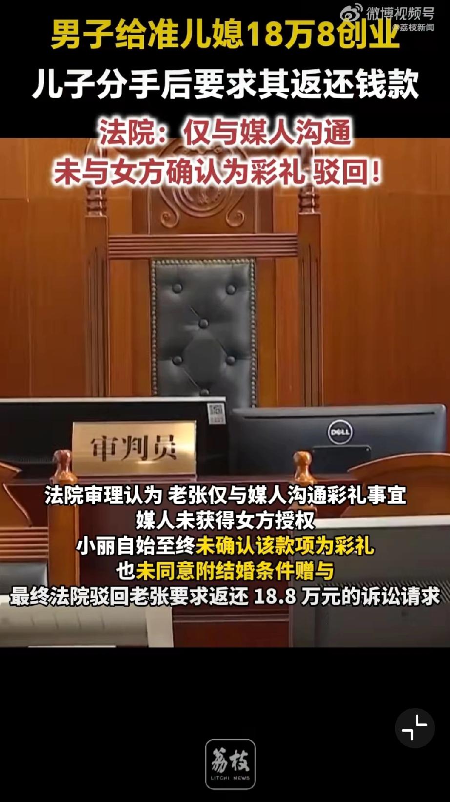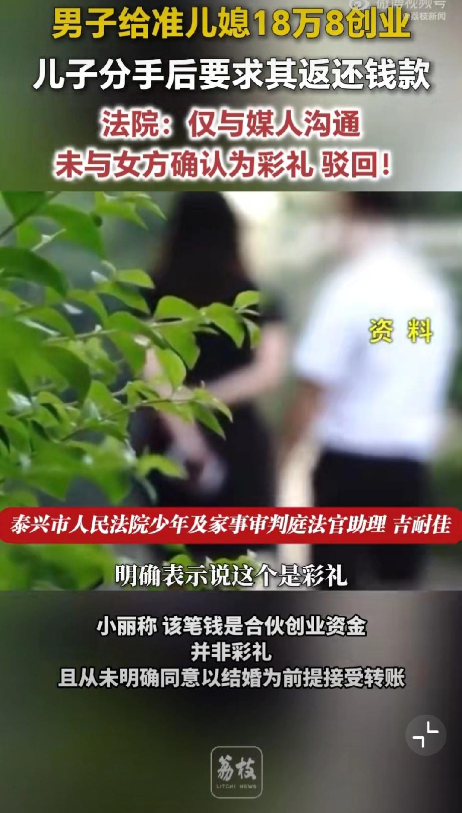 给准儿媳18万8创业分手索要被拒。老张为促成儿子小张与小丽的婚事,在媒人告知下,向小丽转账 18.8 万元用于开办乐器培训机构,老张与媒人认定该笔款项为彩礼。后两人恋情终止,老张要求小丽返还钱款,遭到拒绝。小丽辩称,该笔钱是合伙创业资金,并非彩礼,且从未明确同意以结婚为前提接受转账。 法院审理认为,老张仅与媒人沟通彩礼事宜,媒人未获得女方授权,小丽自始至终未确认该款项为彩礼,也未同意附结婚条件赠与。最终法院驳回老张要求返还18.8万元的诉讼请求。 儿媳妇没了,18.8万也没了。彩礼打官司 彩礼创业