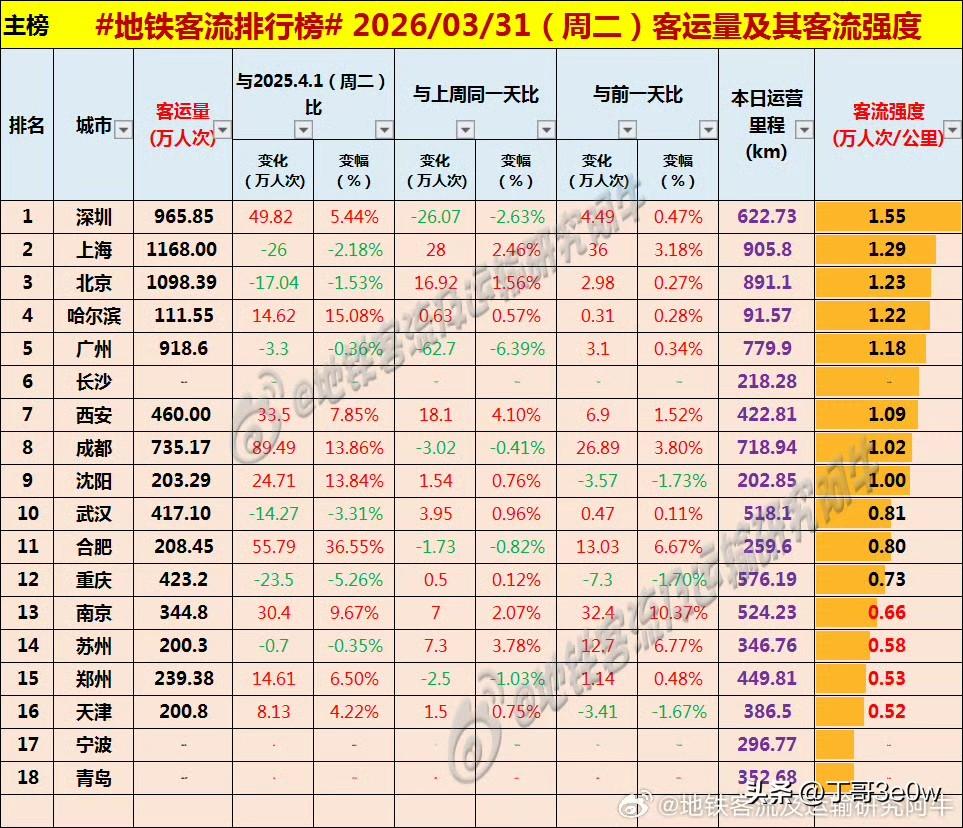 深圳地铁客流量3月最后一天实现965万人次以上,持续超过广州[呲牙][呲牙][呲牙] 爆料 身边事 排行榜 周二 深圳 广州 2026年3月31日 星期② 全国重点城市轨道交通客流量排行榜: 上海:1168.00万 北京:1098.39万北京身边事 深圳:965.85万 广州:918.60万广州地铁 成都:735.17万 西安:460.00万西安爆料 重庆:423.20万重庆身边事 武汉:417.10万 南京:344.80万南京地铁 长沙:239万+ 郑州:239.38万郑州爆料 合肥:208.43万合肥身边事 沈阳:203.29万沈阳地铁 天津:200.80万天津身边事 苏州:200.30万 青岛:111万+青岛爆料 宁波:111万+宁波地铁 哈尔滨111.55万