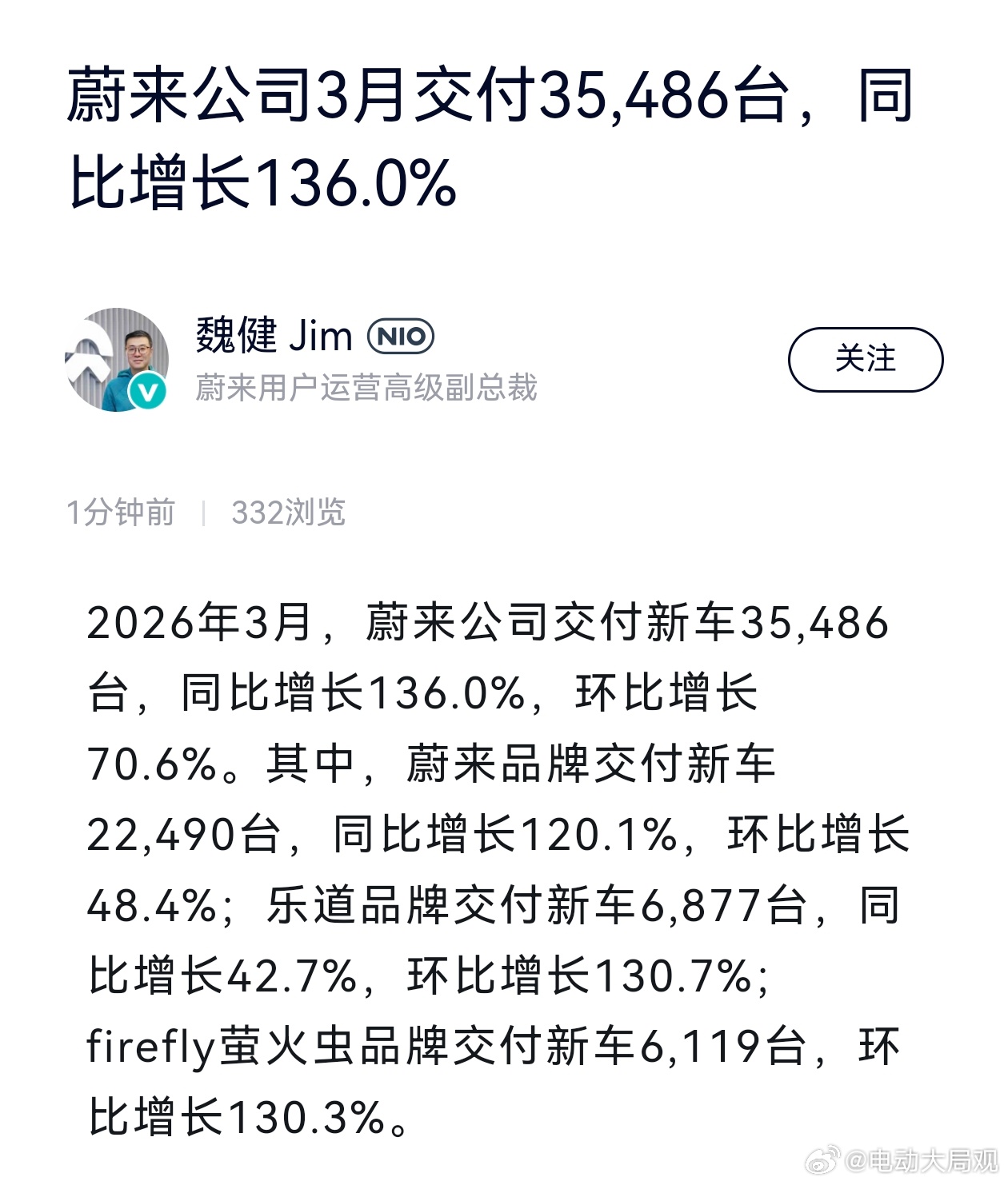 蔚来3月交付35486台新车同比和环比均大幅增长蔚来品牌22490全新ES8交付16255乐道6877萤火虫6119蔚来汽车大局观观车
