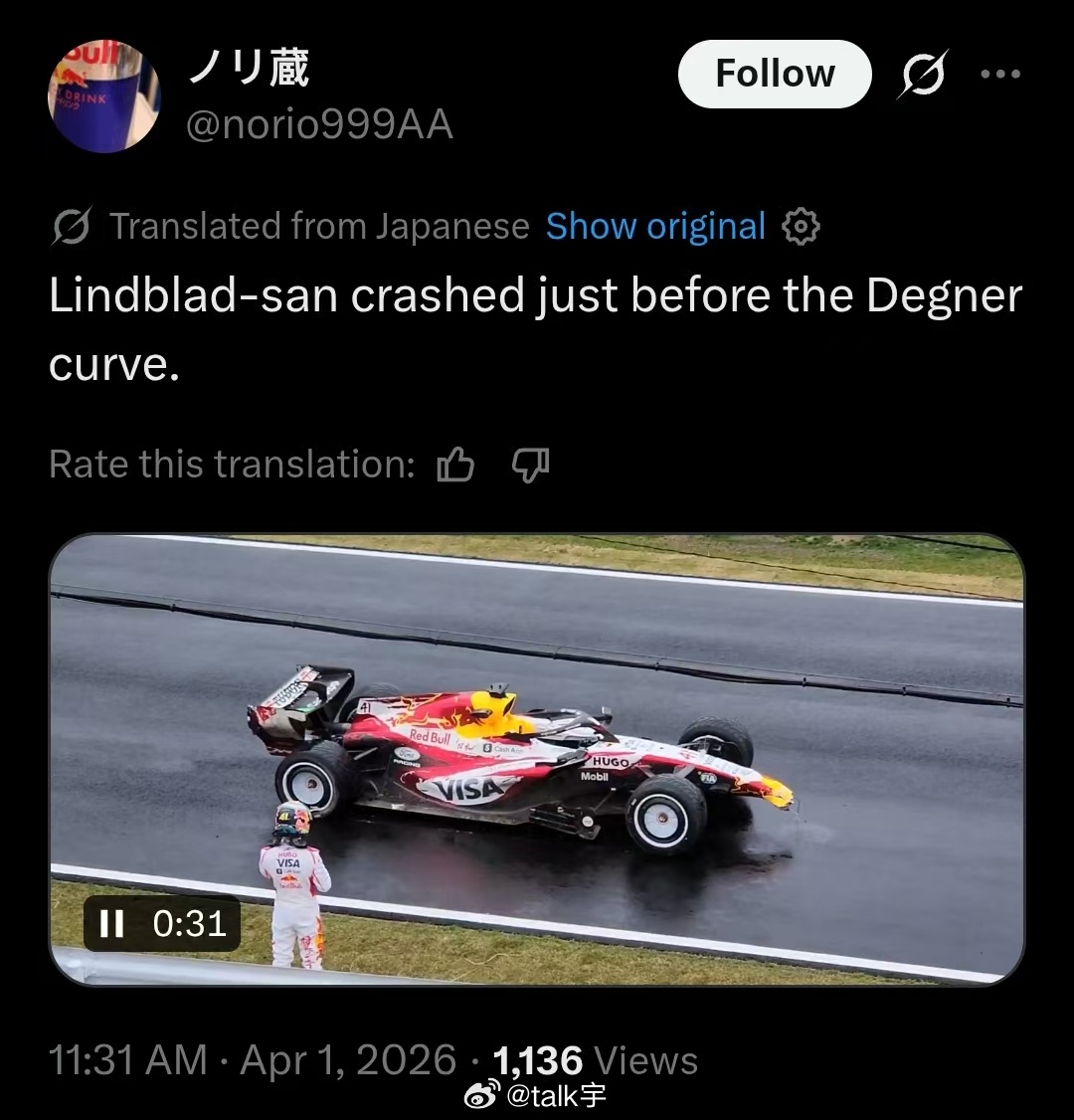 大小红牛在铃鹿进行明年的轮胎测试,林德布拉德发生赛道事故F12026f1日本大奖