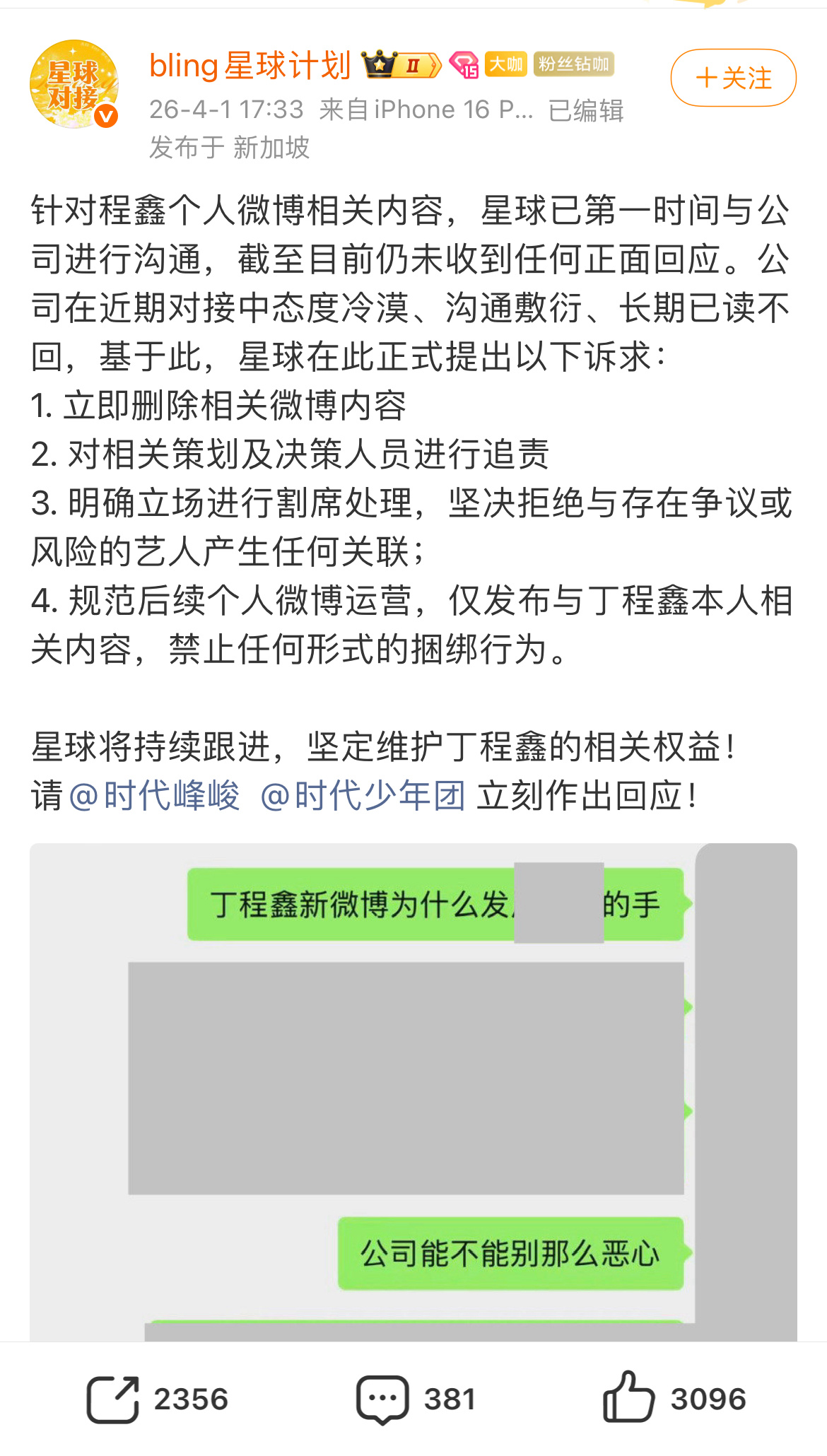 丁程鑫发了严浩翔 丁程鑫微博发的疑似是严浩翔的手,丁程鑫粉丝发文要求公司删除割席