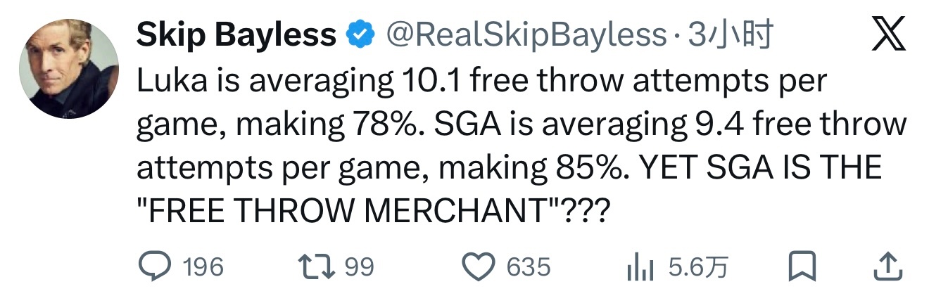 Skip:“东契奇场均10.1次罚球,命中率78%。而亚历山大场均9.4次罚球,命中率85%。然而,亚历山大却被称作‘罚球之王’???”