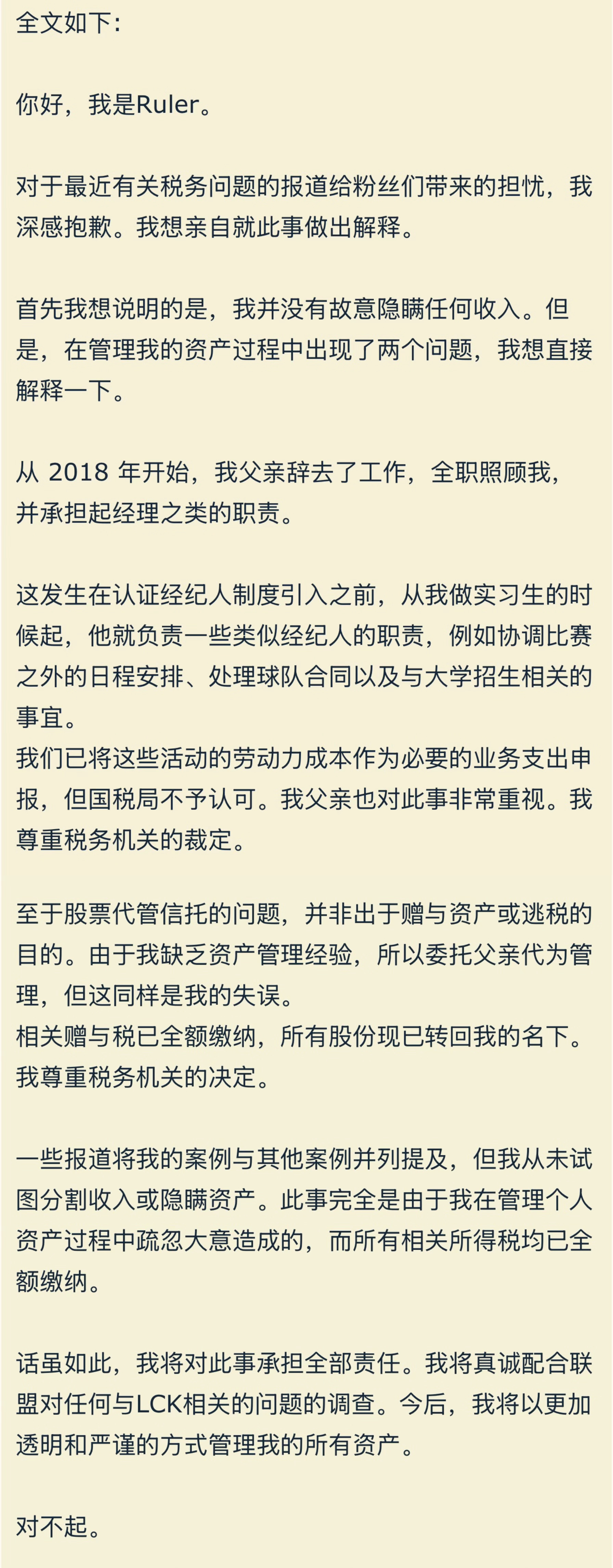 Ruler选手在个人社交媒体回应税务问题