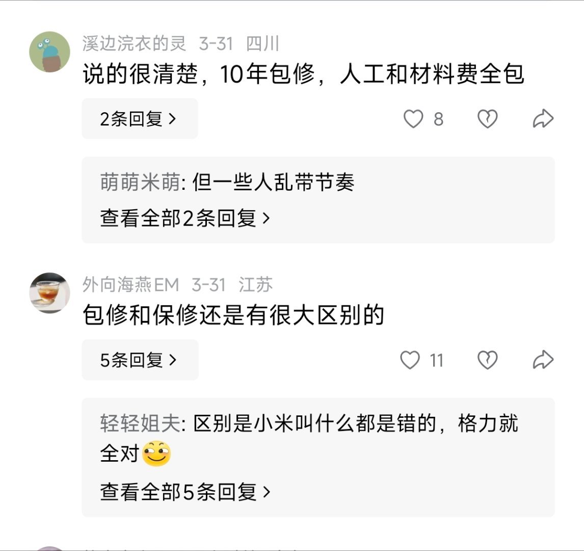 截止到今天,还有很多网友认为小米10年包修还需要收费。