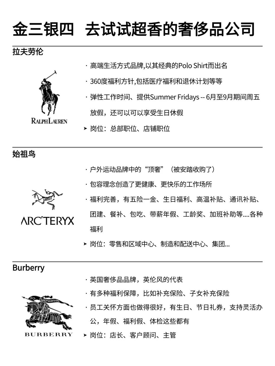 最近盘公司发现奢侈品公司真的很香,福利还很好,金三银四真心可以去试试! . 奢侈品公司为什么值得去? 奢侈品行业属于朝阳行业,市场空间和潜力很大;有一些岗位对于专业的限制不高,包容性比较强;发展潜力也比较大,薪资待遇不错,还有超香的员工内购;门店和办公室都很精致,日常工作氛围也很舒服;对女性还特别友好,很多leader都是女性;企业文化也很包容,有很多提升审美的机会! . 坚持日更✊🏻,帮大家在找工作路上顺利拿到offer! .