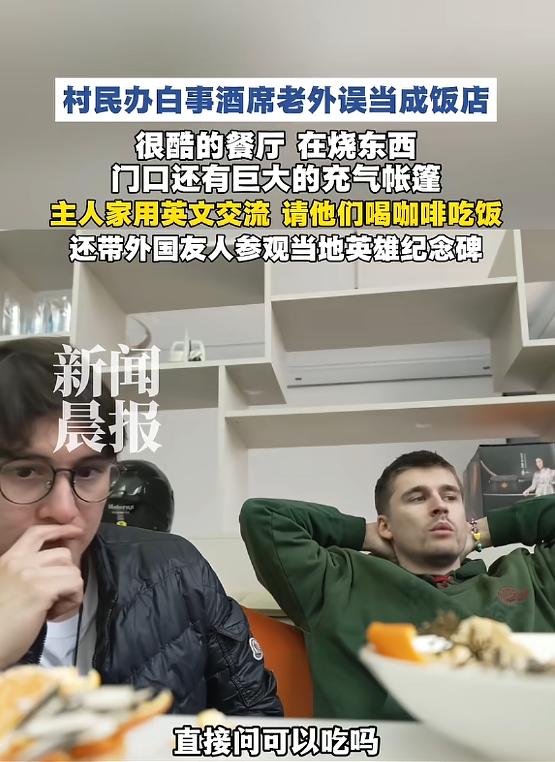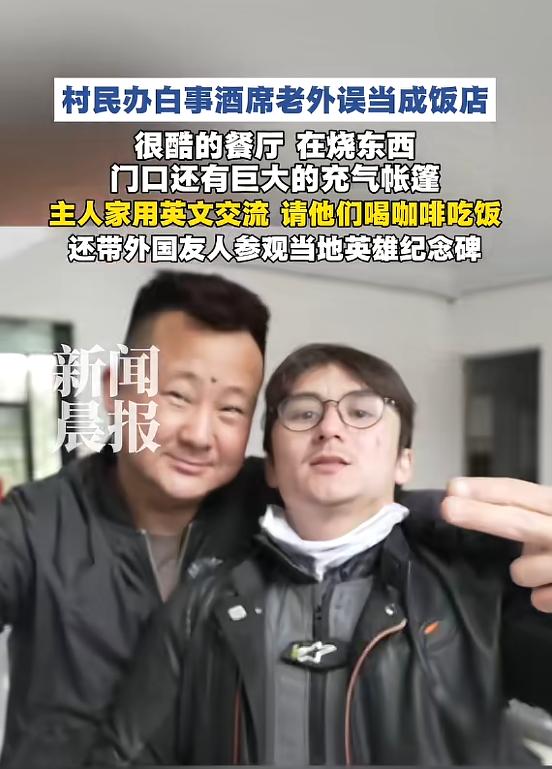 “这就是格局!”近日,湖南,两名美国博主在骑行时迷了路,路过一家村庄时,发现不少人披麻戴孝的聚在一起,他们误以为这是一家餐厅,就直接上去问可以吃吗?没想到主人家不仅不介意,还热情招待他们吃饭,尽显格局!网友:洋相还得洋人出! 事情发生在今年3月30号,这天花桥村的盘山土路上,两辆重型摩托车轰隆隆地行驶着,骑车的就是这两位美国小哥,他们本来计划从广东一路越野,直奔内蒙古大草原,野心勃勃,可没想到到了湖南这片九曲十八弯的大山里,导航彻底失灵了,两人彻底迷了路,连往哪个方向走都不知道。 当时四下望去,全是漫山遍野的绿色,前不着村后不着店,两人早就饿得肚子咕咕叫,饿到两眼发花、浑身无力,就在他们走投无路的时候,转过一个急弯,突然看到一片大红色的充气拱门,旁边还有一座巨大的红帐篷,帐篷里人声鼎沸,特别热闹。 帐篷旁边的大锅灶里,钢炭烧得噼啪作响,热水翻滚,炖菜和烀肉的香味顺着山风飘过来,勾得人直流口水,偶尔还有烟花升空,旁边还有乡村乐队吹吹打打,场面十分热闹。 两个美国小哥隔着头盔看过去,看到满院子的人都穿着白衣,没多想直接断定这是一家网红农家乐,想着终于能吃上一口热饭了。 饿极了的两人,根本没心思仔细琢磨,一脚油门开到大院门口,拔掉车钥匙就跳了下来,大步流星地走进红拱门,用蹩脚的中文混着英语,大声询问能不能点菜吃饭,可他们话音刚落,原本喧闹的院子瞬间安静下来,连吹唢呐的大爷都愣了半天,场面一度十分尴尬。 他们哪里知道,这根本不是什么农家乐,也不是什么热闹的派对,而是一场正在举办的传统葬礼,只不过在湖南邵阳这边,百岁老人去世,举办的是“喜丧”,因为百岁无疾而终是天大的福气,所以后代不会太过悲伤,反而会敲锣打鼓,热热闹闹地送老人最后一程,这也是当地的乡土习俗。 这两个美国小哥压根不懂中国的“喜丧”文化,在他们的认知里,葬礼都是压抑、肃穆的,所有人都穿着黑衣服默哀,根本不会这么热闹,所以他们才会闹出让人啼笑皆非的乌龙,误把喜丧当成了餐厅,还大咧咧地要求吃饭,换成一般人,说不定早就生气赶人了。 可让人没想到的是,这家的主人家李大哥,看出了两人的窘迫和误会,没有生气,也没有甩脸子,反而十分大度,他本身也是个摩托车爱好者,能体会到两人迷路又饥饿的绝境,而且他也明白,这是文化差异造成的乌龙,不是两人故意冒犯。 李大哥用流利的英语和两人沟通,没有直接说这是葬礼,而是委婉地解释,家里有位百岁老人,大家聚在一起为老人庆祝,既保住了两人的尊,也化解了尴尬。 之后他还暂时放下手头的事,带着两个美国小哥在村里转了转,等家里开席的时候,又热情地拉着他们坐下吃饭,给他们盛饭夹菜,像招待远方来的朋友一样。 吃完饭两个美国小哥准备继续赶路,李大哥还特意给他们准备了矿泉水和干粮,叮嘱他们路上小心注意安全,这件事传到网上后,网友们纷纷点赞,有人调侃“洋相还得洋人出”,更多的人则感慨主家的格局太大。 在自己家办葬礼,被陌生人误闯还随口要求吃饭,不仅不介意还热情招待,这份包容和善良,正是中国人刻在骨子里的温柔,也让我们看到了乡土人情最动人的样子。 (信息来源:《村民办白事酒席老外误当成饭店,主人家用英文交流,请两位外国人喝咖啡吃饭》新闻晨报)