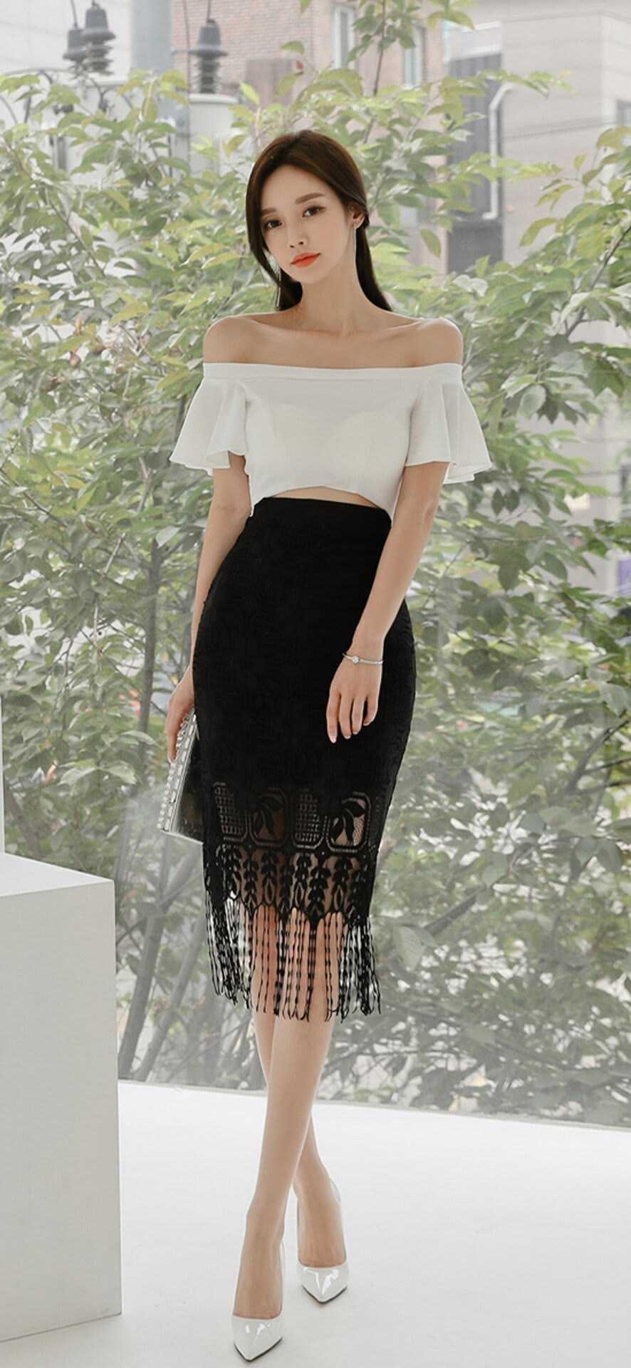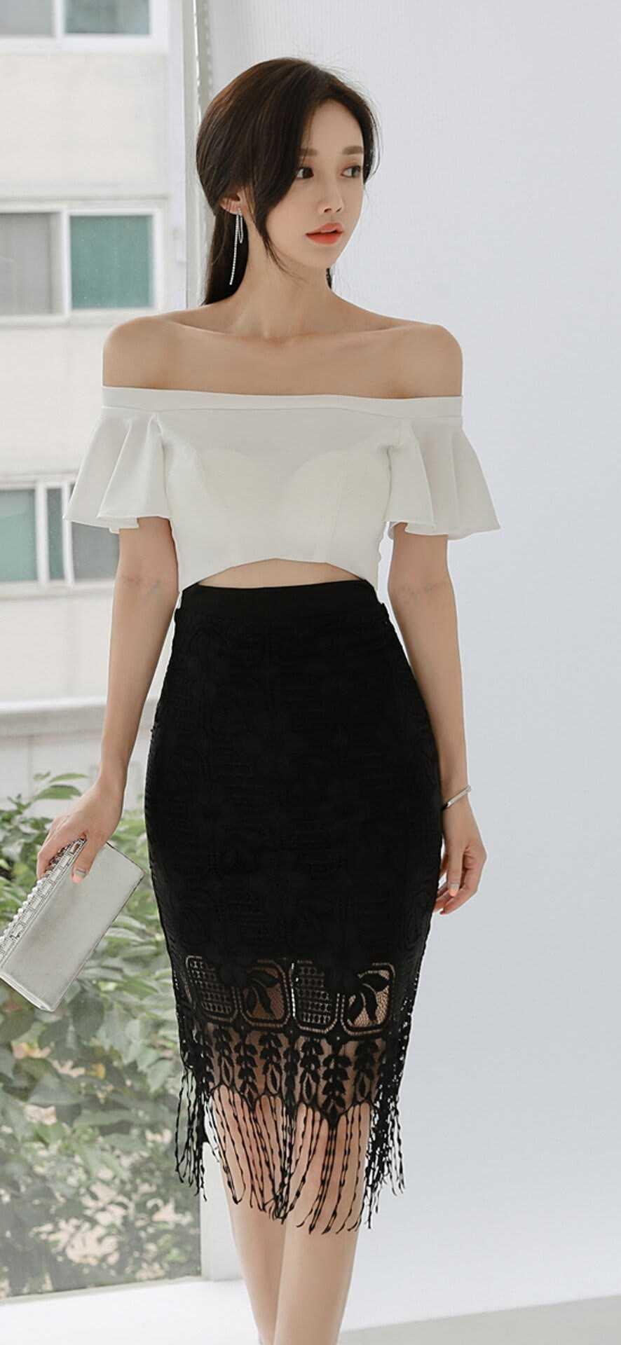 黑裙如何穿出高级感?黑白撞色是永不过时的高级密码。一字肩露肩上衣勾勒肩颈线条,荷叶袖添柔媚;黑色蕾丝流苏包臀裙,用精致蕾丝与灵动流苏,在修身剪裁中释放女人味。简约配饰加持,于细节处彰显品味,让成熟女性的优雅与性感,在一颦一笑间自然流露,轻松拿捏职场与约会的双重氛围感。