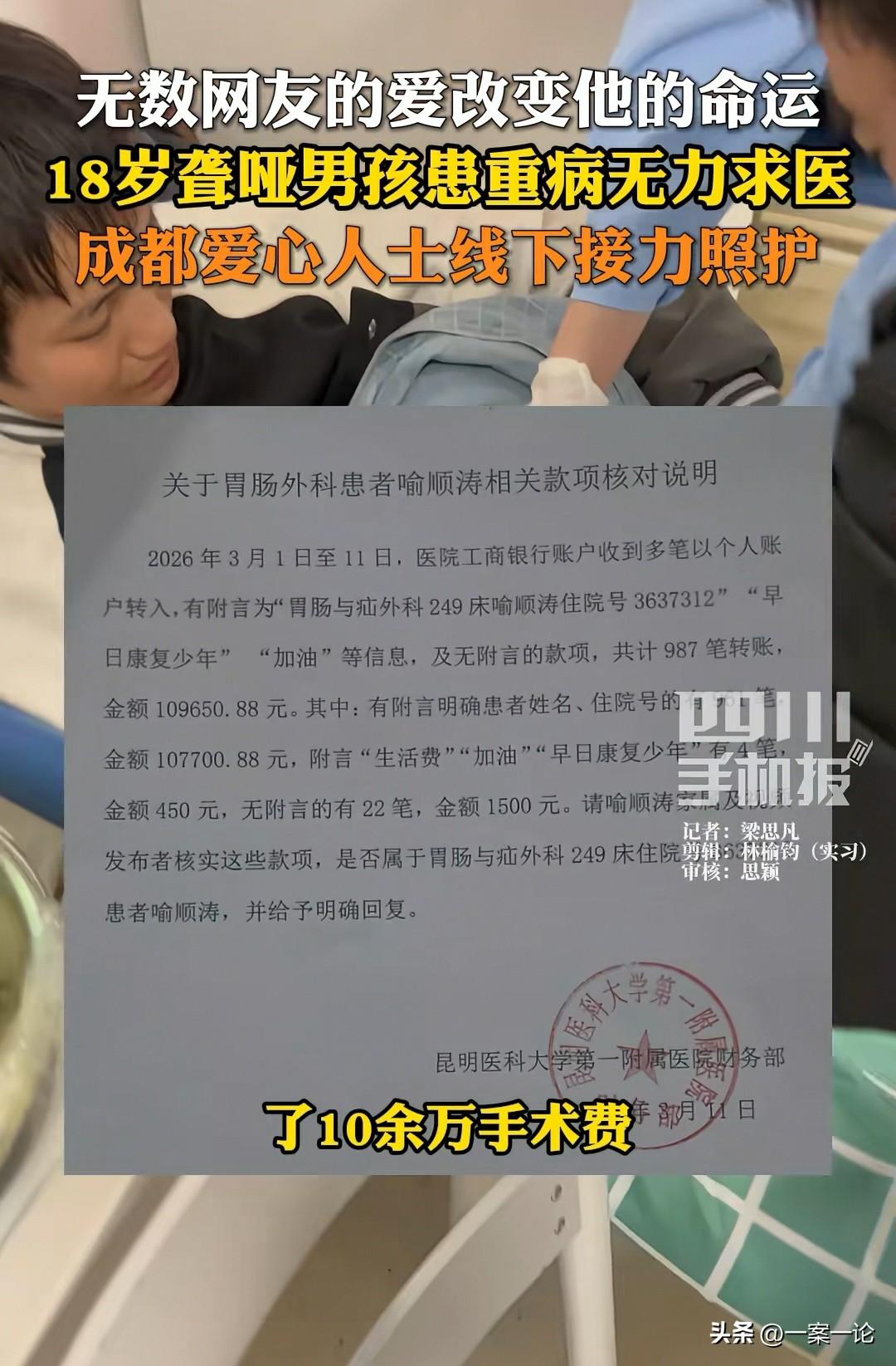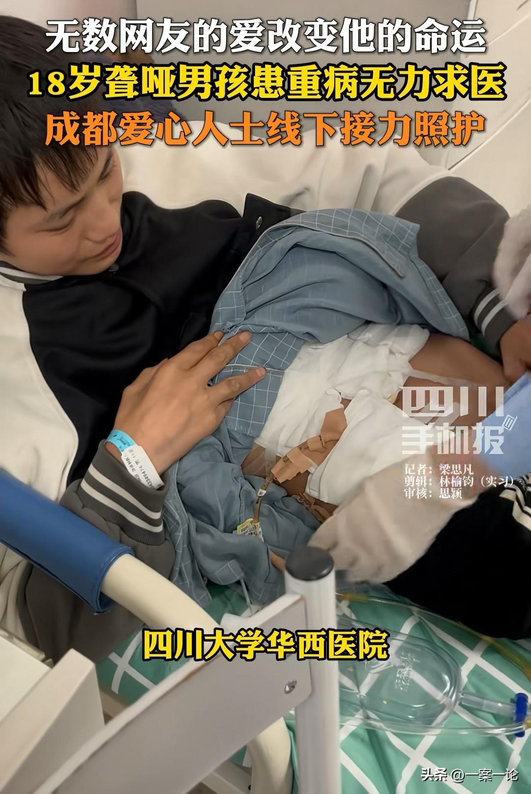 “这就是互联网的力量!”四川成都,一个18岁的聋哑小伙,身患重病,得了肠瘘,体内还有大量脓包,病情危急,小伙已经病得皮包骨了,只有60多斤,他从进了医院就一直哭,或许是感到命运不公,不但聋哑,身患重病,还出生在贫苦的家庭,无法凑钱做手术,同病房的病患家属看到了,就发了一条视频,结果这条视频救了小伙一命。 姚女士的家人生病了,她在医院陪护家人,病房里,住进了一个18岁的小伙,是个聋哑人,住进来之后,就一直哭哭啼啼的,他一把鼻涕一把泪,他无法把自身的痛苦说出来。 他那瘦骨嶙峋的身体,只剩60多斤了,一个18岁的小伙,瘦成这般,姚女士能感受到,他正在受着病痛的折磨。 后来一打听,才知道这个小伙不但是个聋哑人,还身患重病,得了肠篓,身体内有大量的脓包,痛苦可想而知。 看着一个小伙,正是为前途拼搏的年龄,正是在学校沐浴知识的年纪。 他只能在他那无声的世界里,承受着说不出的痛苦。 更让姚女士心疼的是,她得知这个聋哑小伙,他的兄弟姐妹有4个,有两个是聋哑人,全家人都靠补助金生活,困难可想而知。 小伙进了医院就哭哭啼啼,或许是因为自身的病痛,或许是因为家中贫困的无奈,家里没有那么多钱,拿出来给他动手术,他只能遵循命运的安排。 可他才18岁,即使是个聋哑人,他也依然希望自己身体健康,感受世间的美好。 看着小伙一直哭个不停,一把鼻涕,一把泪,看得姚女士又心疼又揪心。 她决定帮助这个可怜的小伙,于是就拍了一条视频。 让她没想到的是,她的这条视频,居然救了小伙一命。 当时她把小伙的情况拍了下来,并且说明了小伙的情况,视频一发出,引起了广泛网友的关注。 大家都关心这个身患重病的小伙,都希望助他走出困境,短短一天时间,姚女士就因为这条视频,帮小伙筹到了10多万的手续费,足够他动手术了。 这个视频带来的力量还远远不止这些,接下来发生的事情,更是改变了小伙的人生。 因为姚女士的视频,小伙凑够了10多万的手术费,为了得到更好的治疗,他们连夜赶往四川大学华西医院。 消息一传出,成都的爱心人士们坐不住了,他们迅速响应,和姚女士建立了一个爱心群,从此这个小伙的生活改变了。 爱心人士们不但捐款,还知道小伙和家人,在这边人生地不熟,需要很多的帮助,他们轮流来医院照顾这个素不相识的男孩。 有人带来了自己做的爱心营养餐,让小伙有充足的营养支撑着身体,有的人给他们安排住宿,让小伙养足精神,配合治疗,还有的人忙前跑后,又是来帮忙拿药,又是来帮办手续,或是帮忙挂号。 有了他们的帮助,小伙很是感动,在大家的暖意中,他更有信心战胜自身的病魔了,他不再哭哭啼啼,而是配合治疗,用最大的努力,不辜负所有帮助他的人。 在大家的帮助下,小伙的手术成功了,他的脸色日益红润,脸上的笑容展开了,小伙的姐姐说,如果没有大家的帮忙,就没有弟弟的今天,她弟弟的手术很成功。 看到小伙终于手术成功,身体将会慢慢康复,爱心人士们还表示,等小伙身体好了,要给他配耳蜗,让他听到这个世界爱他的声音。 相信小伙在大家的帮忙下,将会对自己的人生充满希望,他将会用更加乐观的态度,对待自己的人生。 一个视频,让素不相识的人,帮助一个需要帮助的人,大家做着不陌生,又有温暖的事情,让这份光,照亮了小伙,更是温暖了一座城。 爱心人士们的付出,他们捐款又出力,这些都是道义上的捐赠行为。 《民法典》第658条规定:赠与人在赠与财产的权利转移之前可以撤销赠与。经过公证的赠与合同或者依法不得撤销的具有救灾、扶贫、助残等公益、道德义务性质的赠与合同,不适用前款规定。 对于爱心人士们的善意,他们是不需要回报的,他们只是想看到小伙能够健康快乐地生活着。 那么你对此事有何看法呢?