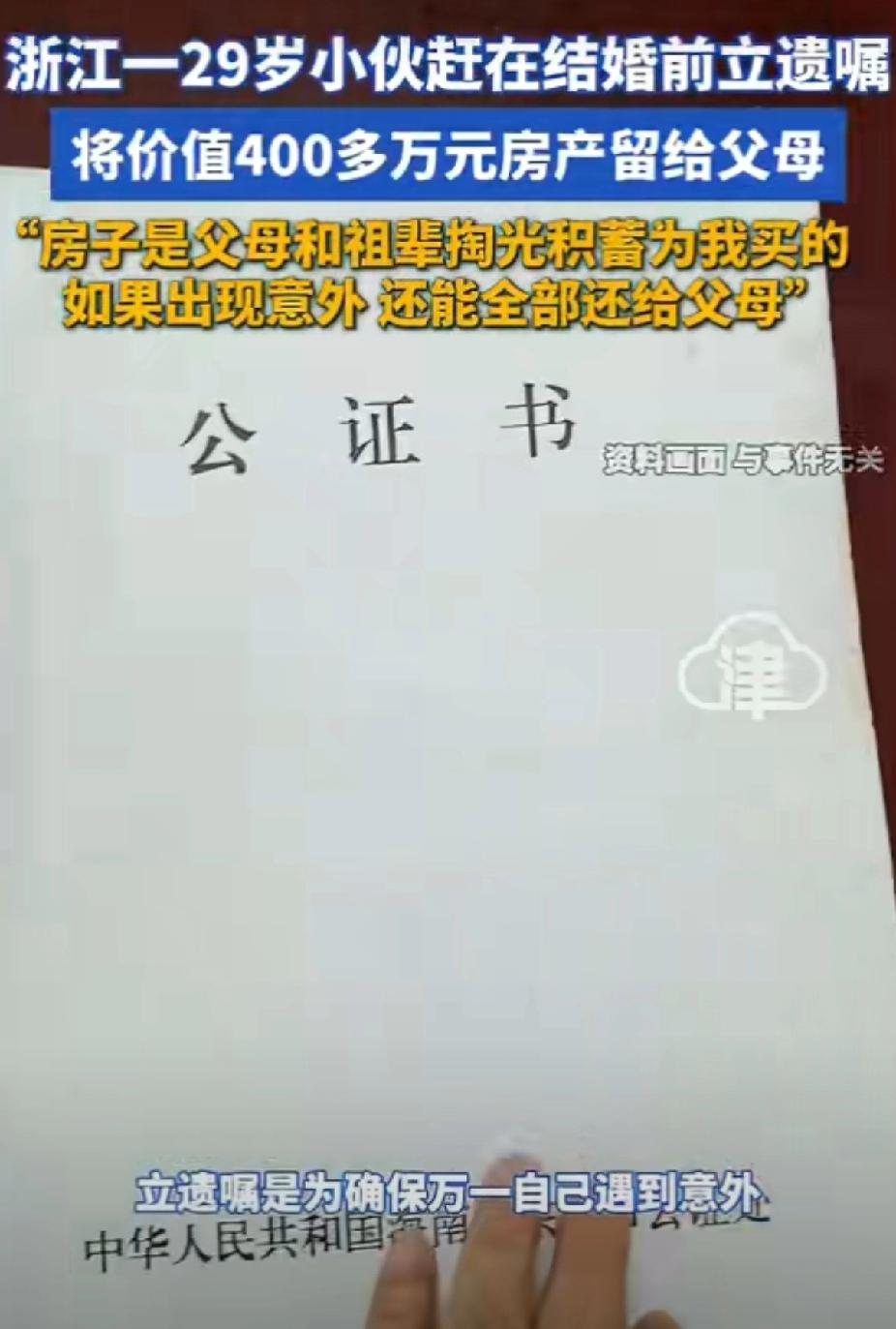 浙江宁波一个29岁小伙子,马上就要5月份结婚了,别人都在忙婚纱照、订酒席,他却先跑去公证处,干了一件大事——婚前立遗嘱! 他把自己名下一套400多万的全款房,白纸黑字写清楚:万一出意外、没孩子,房子全部还给父母,一分都不带走。 小伙子说得特别实在:这房子是爸妈、爷爷奶奶掏光一辈子积蓄买的,是老人的养老钱、血汗钱。不能因为我结婚,让老人最后连保障都没有。 现在很多人一听“立遗嘱”就觉得不吉利、想太多。其实真不是! 这不是算计,不是防谁,就是护父母、懂感恩、讲规矩。 公证员也说了,这几年年轻人立遗嘱越来越多,大家都越来越清醒、越来越懂法了。 房子是父母的心血,婚前说清楚、写明白,既是对父母负责,也是对婚姻负责,坦坦荡荡、明明白白! 大家说说: 你支持婚前立遗嘱吗? 换成你,会这么做吗? 你觉得这是孝顺还是现实? 29岁小伙回应结婚前立遗嘱 婚前立遗嘱小伙称房子掏空父母积蓄