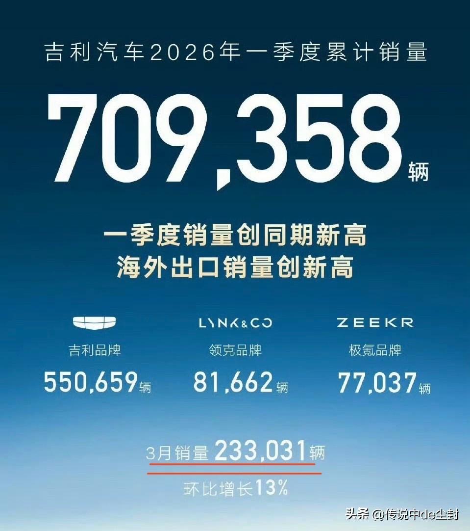 看过了主要新势力品牌3月销量,咱们再来看下两大自主品牌巨头的销量: 比亚迪3月销量300222辆; 一季度累计700473辆。 吉利汽车3月销量233031辆。 一季度累计709358辆。 数据蛮有意思的啊,双方互有“胜负”…… 除此之外,比亚迪和吉利的海外销量也都在大幅增长中: 比亚迪3月海外销量高达119591辆,同比增长65.2%; 吉利3月海外销量81639辆,同比增长120%。 只能说,都很强,都是自主品牌的骄傲!