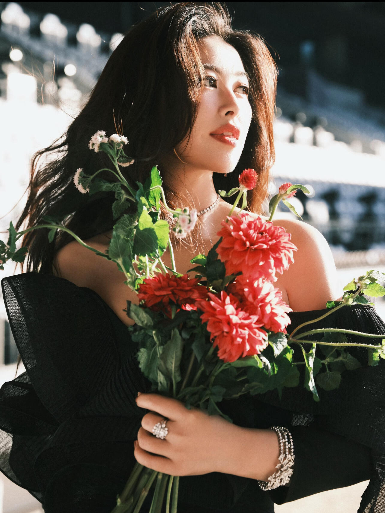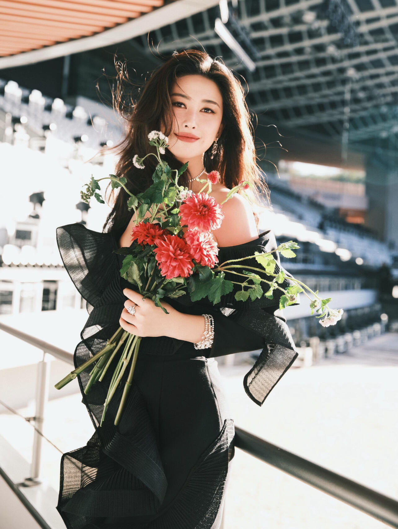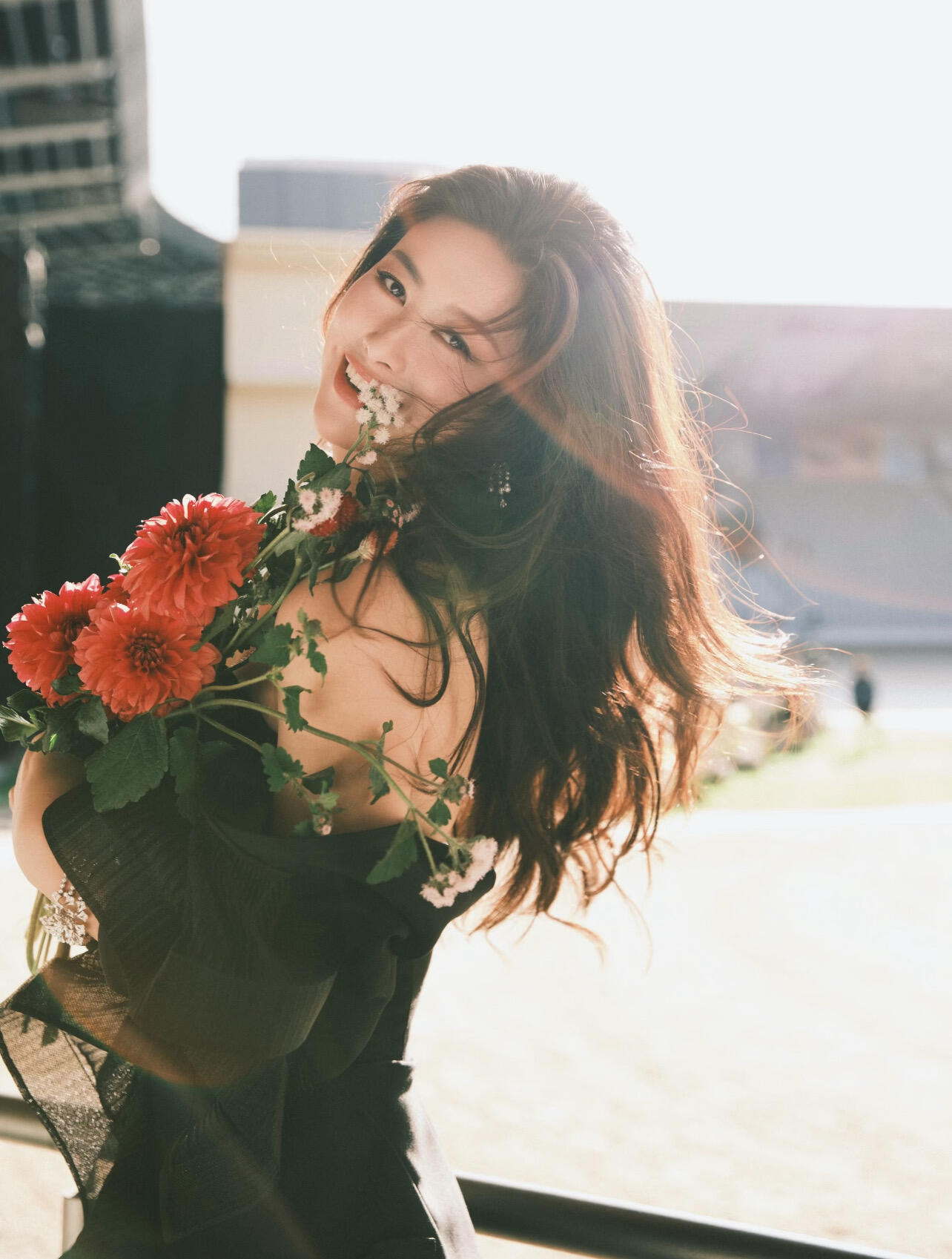 朱珠短开衫高腰白裙 热烈如玫瑰,发现朱珠拍过不少捧花照啊好明媚!