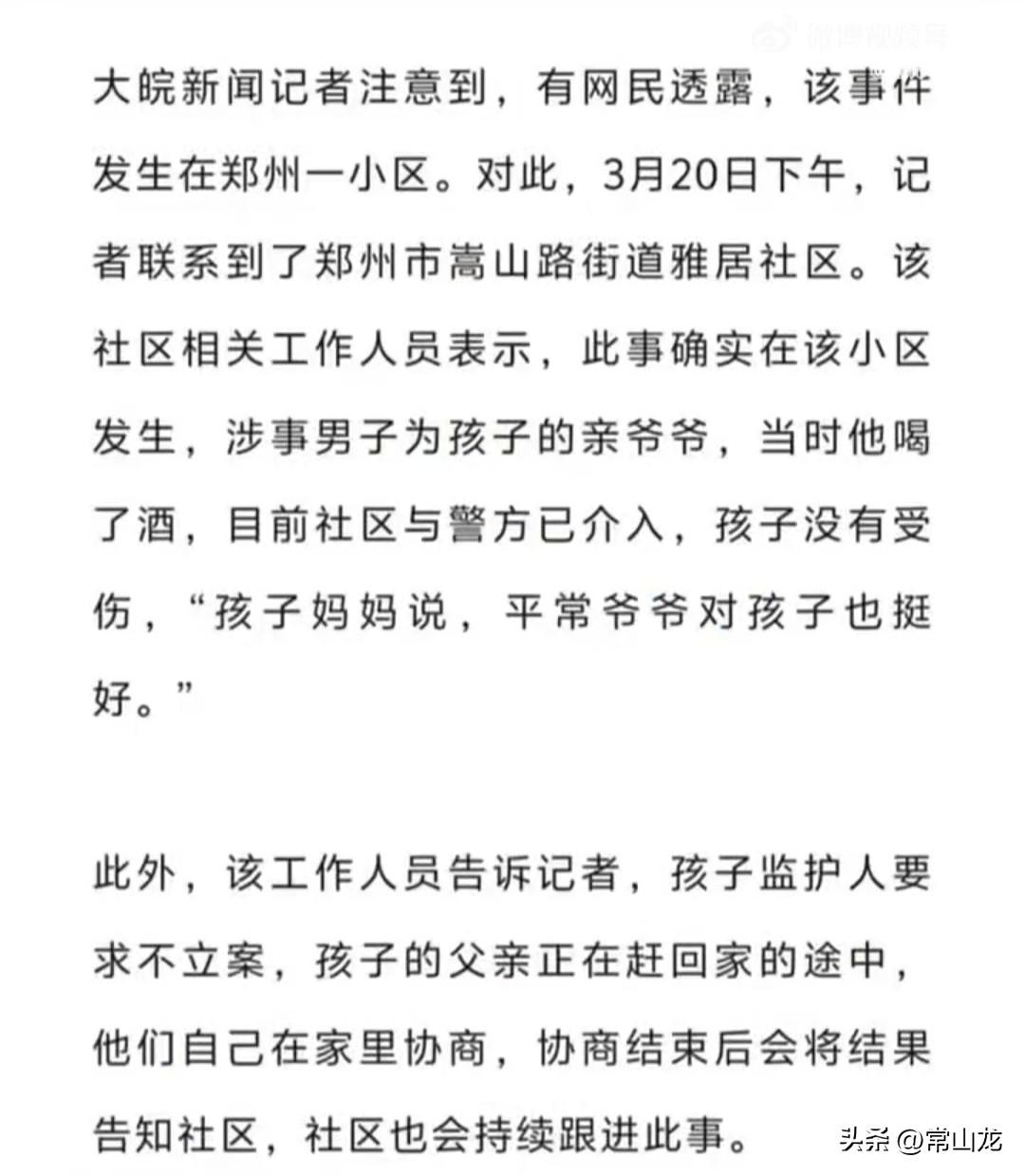 老头坐在花台边,对着摇篮中的宝宝,左一巴掌右一巴掌,孩子被打得哇哇大哭。 这可不是玩耍,而是真的下手打。 这么幼小的孩子,路都走不稳,怎么下得了这么狠的手。 孩子虽然小,但也知道害怕,看他挥起手掌时,柔弱的身躯吓得大哭着往后靠。 但老登不为所动,揪着宝宝的衣领,一把将他拉了坐好,又继续打。 宝宝躲无可躲,避无可避,只能硬生生地承受着老登的施暴,他还不能言语,只能用哭声来表达他内心的恐惧。 可以想象,宝宝幼小的心灵受到了多大的伤害,这残忍的一幕,会给他留下无法磨灭的阴影。 不敢想象宝宝的父母看到这段视频,会作何感想? 据网友透露,该事件发生在郑州一小区,打孩子的是他的亲爷爷,当时他喝了酒。 孩子的母亲说,平常爷爷对孩子也挺好,孩子的爸爸正在赶回家的途中,他们要求不立案,自己在家里协商解决。 原来是灌了几口马尿,既然是喝高了,咋不扇自己,要去扇别人呢? 这种行为太恶劣了,已经涉嫌虐待婴幼儿了。 因为他是孩子的爷爷,孩子的父母,尤其是母亲,心里再有万般不满,也不大可能上升到法律层面去追究责任。 这种情况要是发生在国外,立不立案监护人说了不算,老登绝对会被刑拘的。