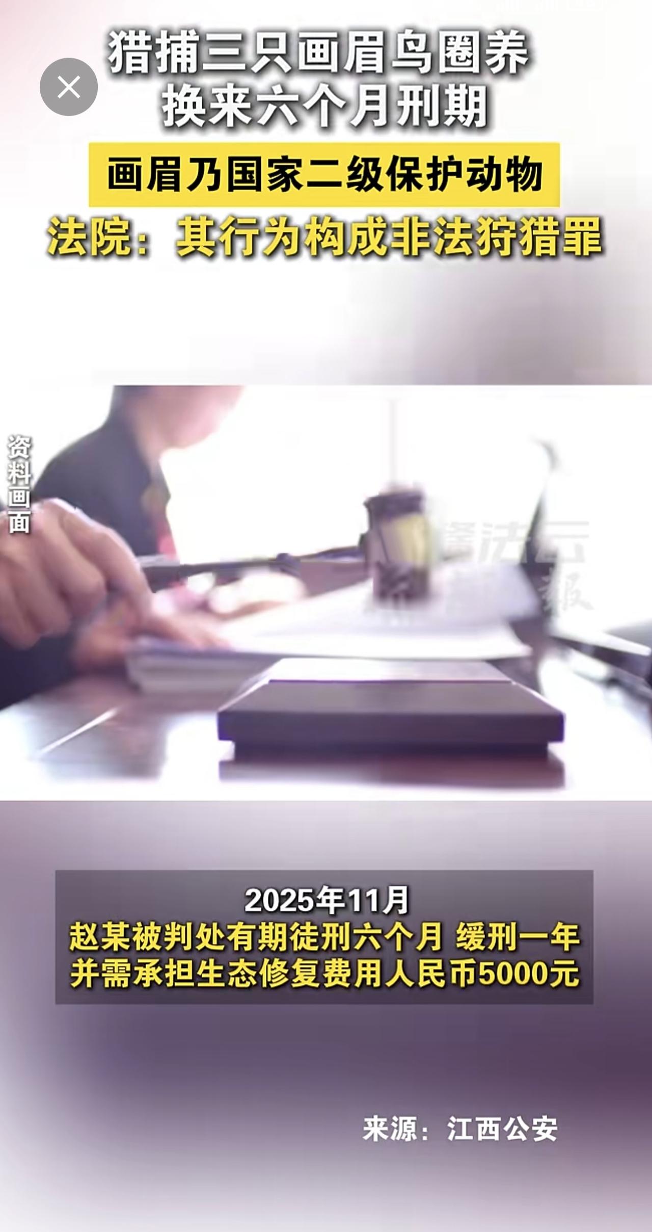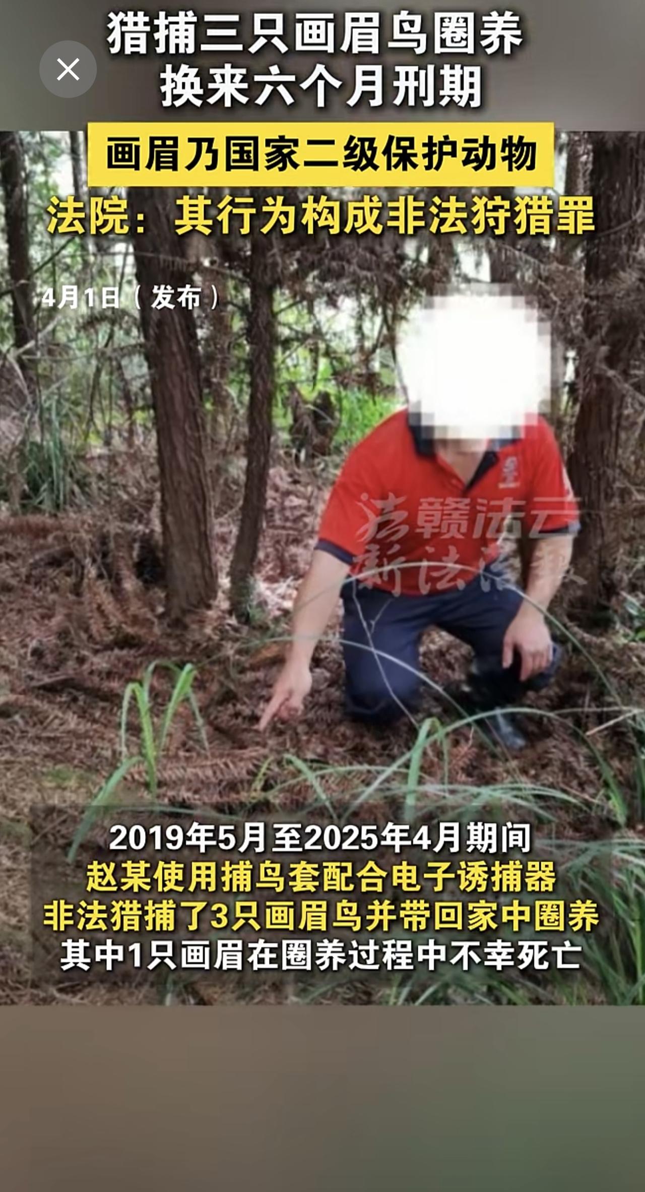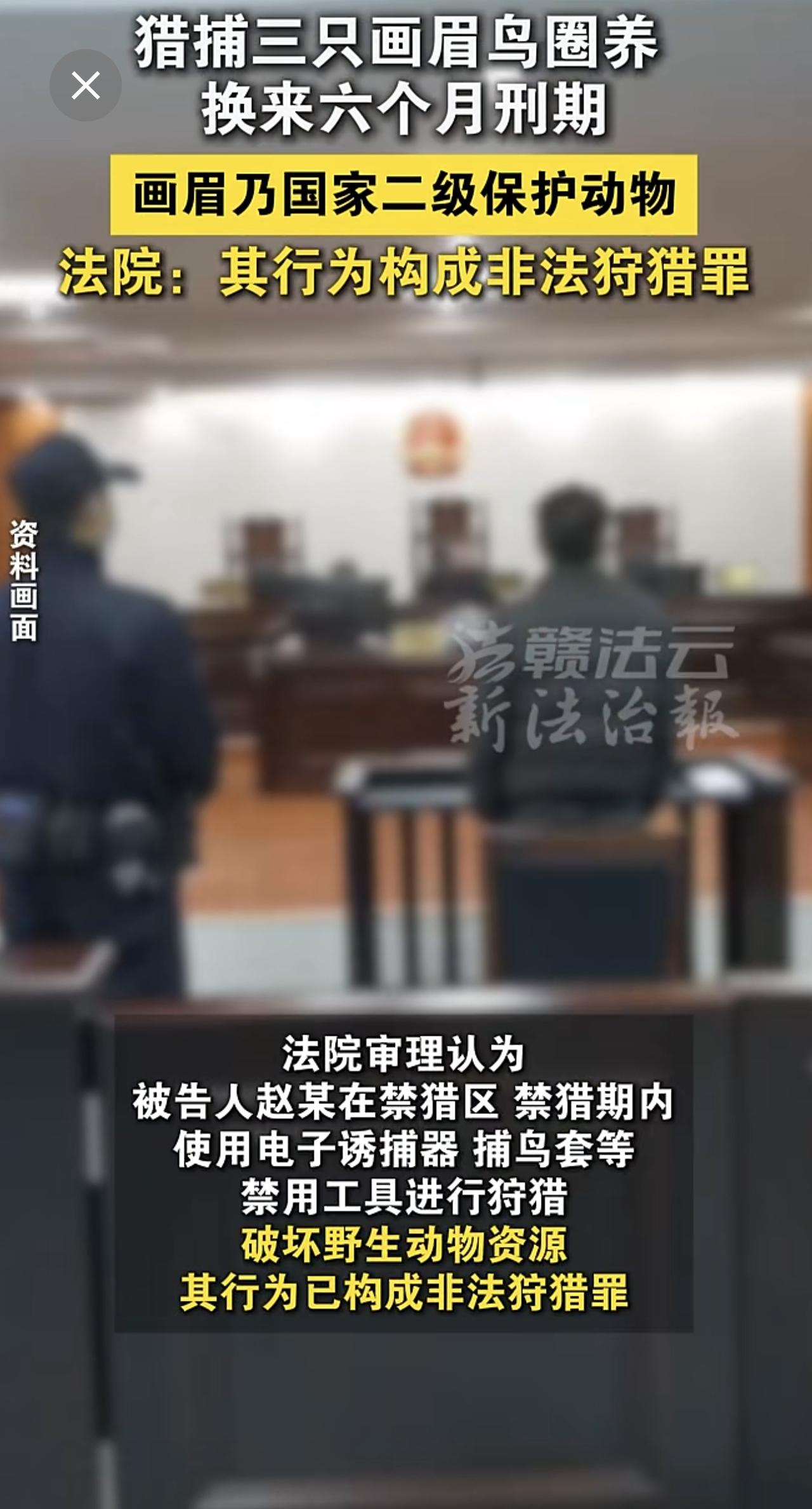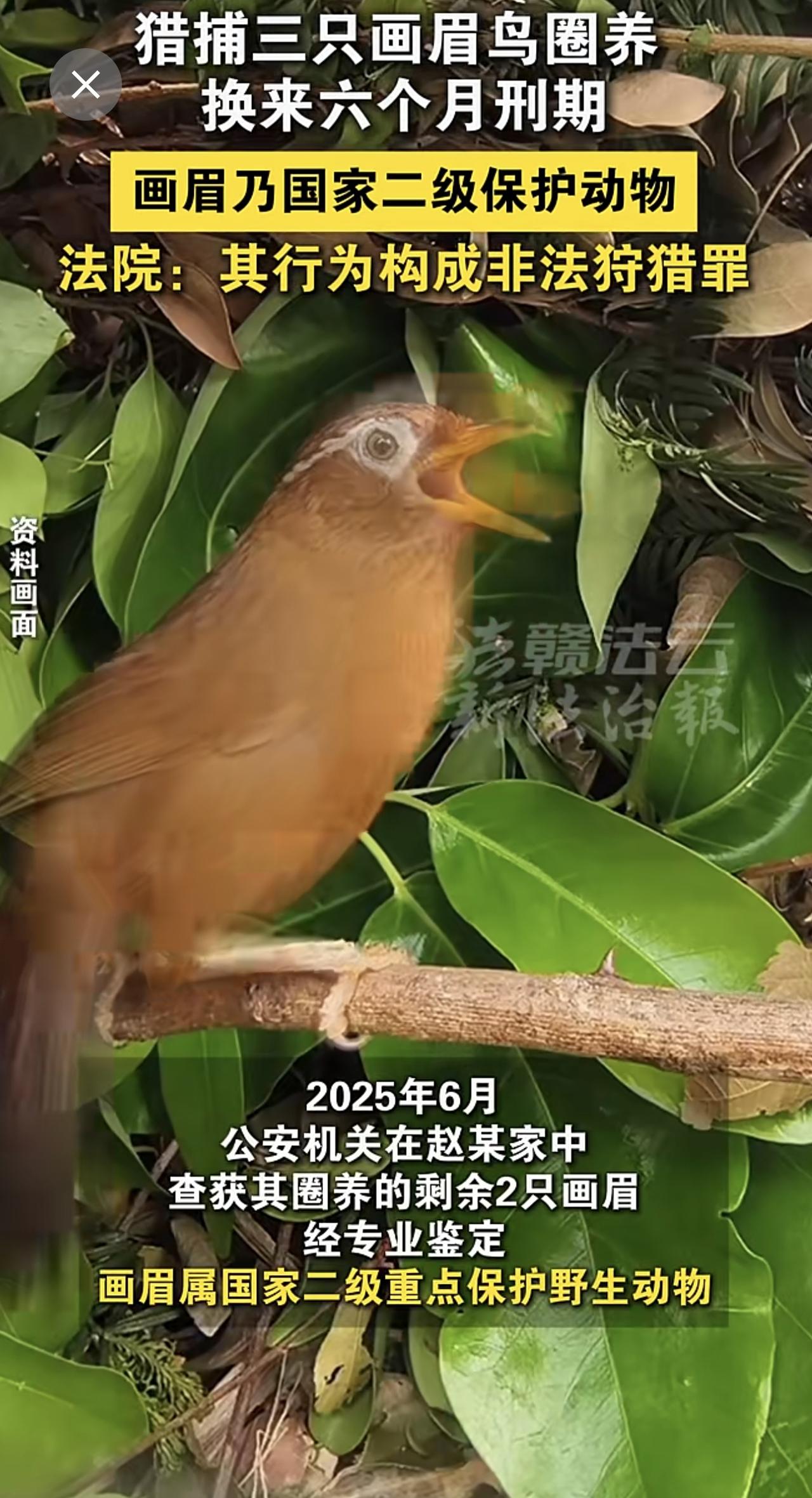 男子非法猎捕3只画眉鸟并带回家中圈养。画眉属国家二级重点保护野生动物。法院:其行为已构成非法狩猎罪,判处有期徒刑六个月。