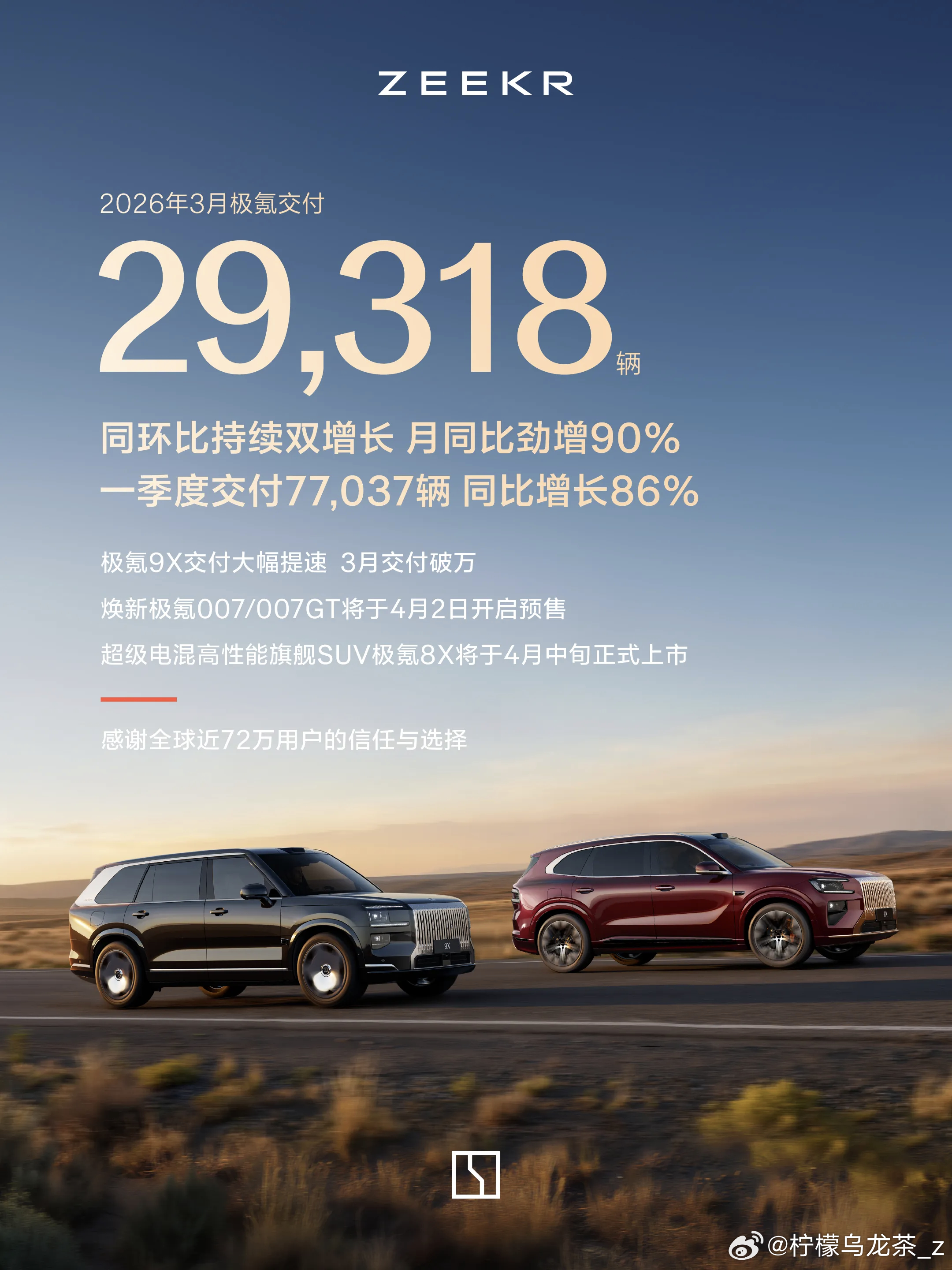 理想汽车3月交付突破4.1万辆极氪3月交付29318辆零跑3月交付重返5万台