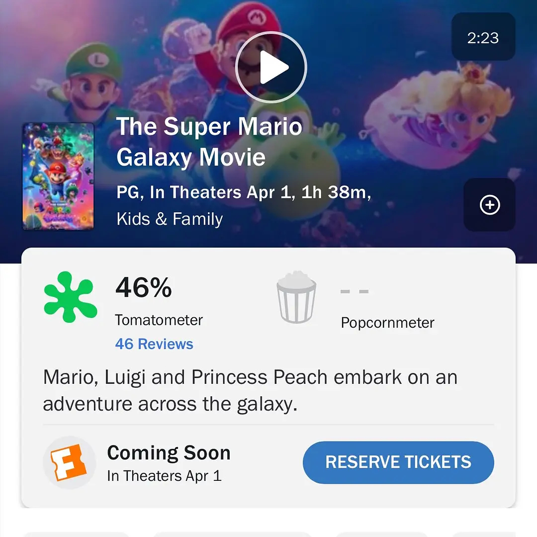 《超级马力欧银河大电影》烂番茄新鲜度只有46%,第一部也是儿童片水平。