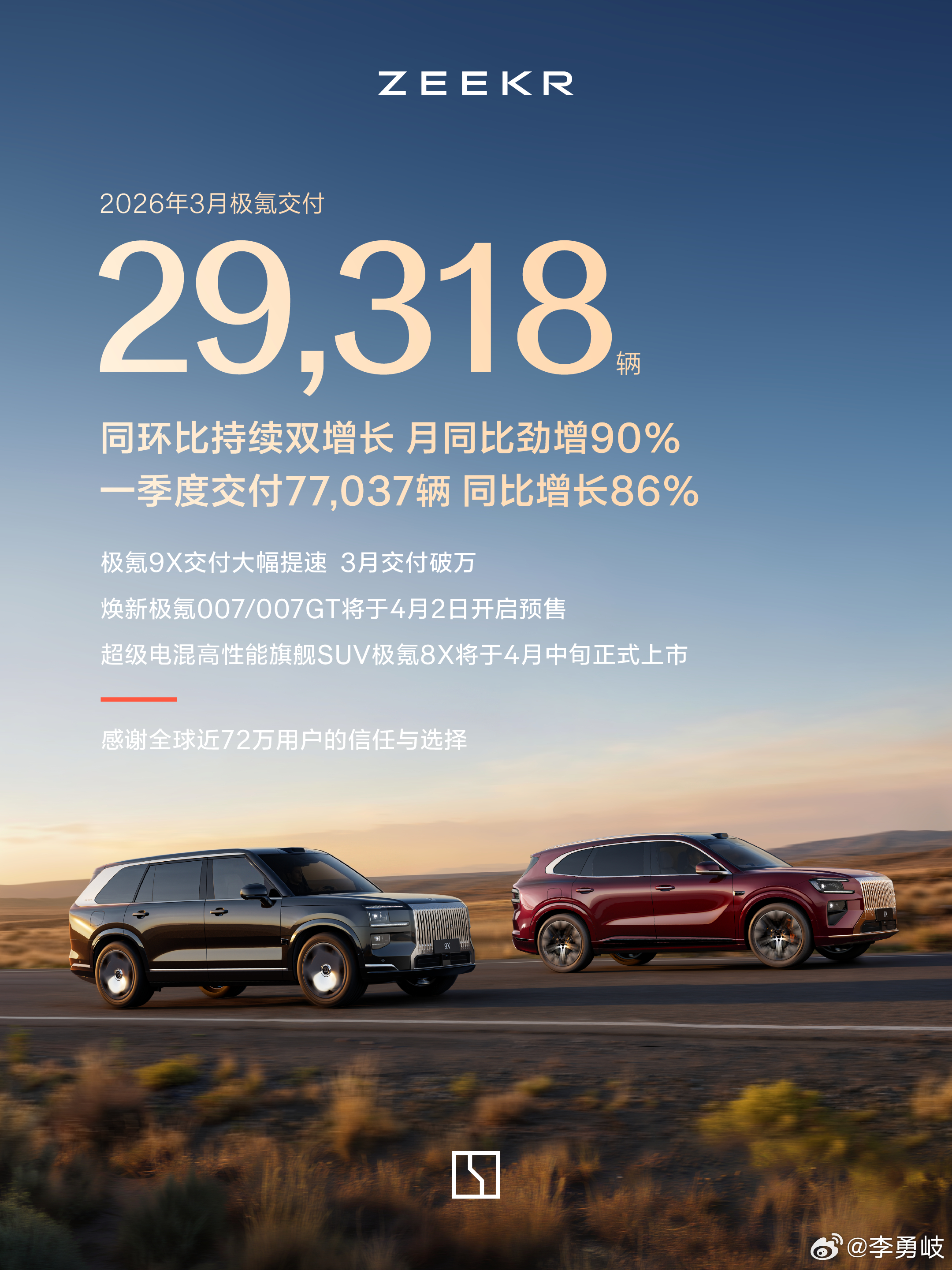 整体销量回暖明显!2026年3月热门造车新势力品牌交付/销量排行榜出炉:1、零跑汽车50029辆2、理想汽车41053辆3、昊铂埃安BU 38268辆4、蔚来公司35486辆(蔚来22490辆、乐道6877辆、萤火虫6119辆)5、极氪29318辆6、小鹏汽车27415辆7、小米汽车超20000辆8、岚图汽车15019辆9、智己汽车7187辆4月1日,春暖花开,各家3月份销量如期而至,在经历了1月、2月的淡季,大部分品牌销量均迎来了回暖。3月的新势力市场呈现出“头部领跑、强者愈强”的格局——零跑强势登顶,理想、蔚来迎来环比暴涨,小鹏、小米稳步前行!纵观3月造车新势力销量,不难发现一个明显趋势:行业分化正在加剧,“马太效应”愈发明显。零跑、理想、蔚来凭借各自的核心优势(性价比、家庭定位、高端服务)领跑市场,实现销量暴涨;小鹏、小米稳步发力,逐步巩固市场地位。随着价格战退潮,行业竞争已从“规模优先”转向“高质量发展”,技术、生态、服务成为核心竞争力。后续,随着各大品牌新品的陆续推出和产能的进一步释放,新势力市场的竞争将更加激烈,谁能持续抓住用户需求,谁就能在淘汰赛中站稳脚跟!汽场全开新能源大牛说大v聊车
