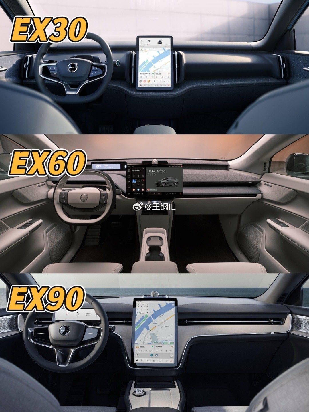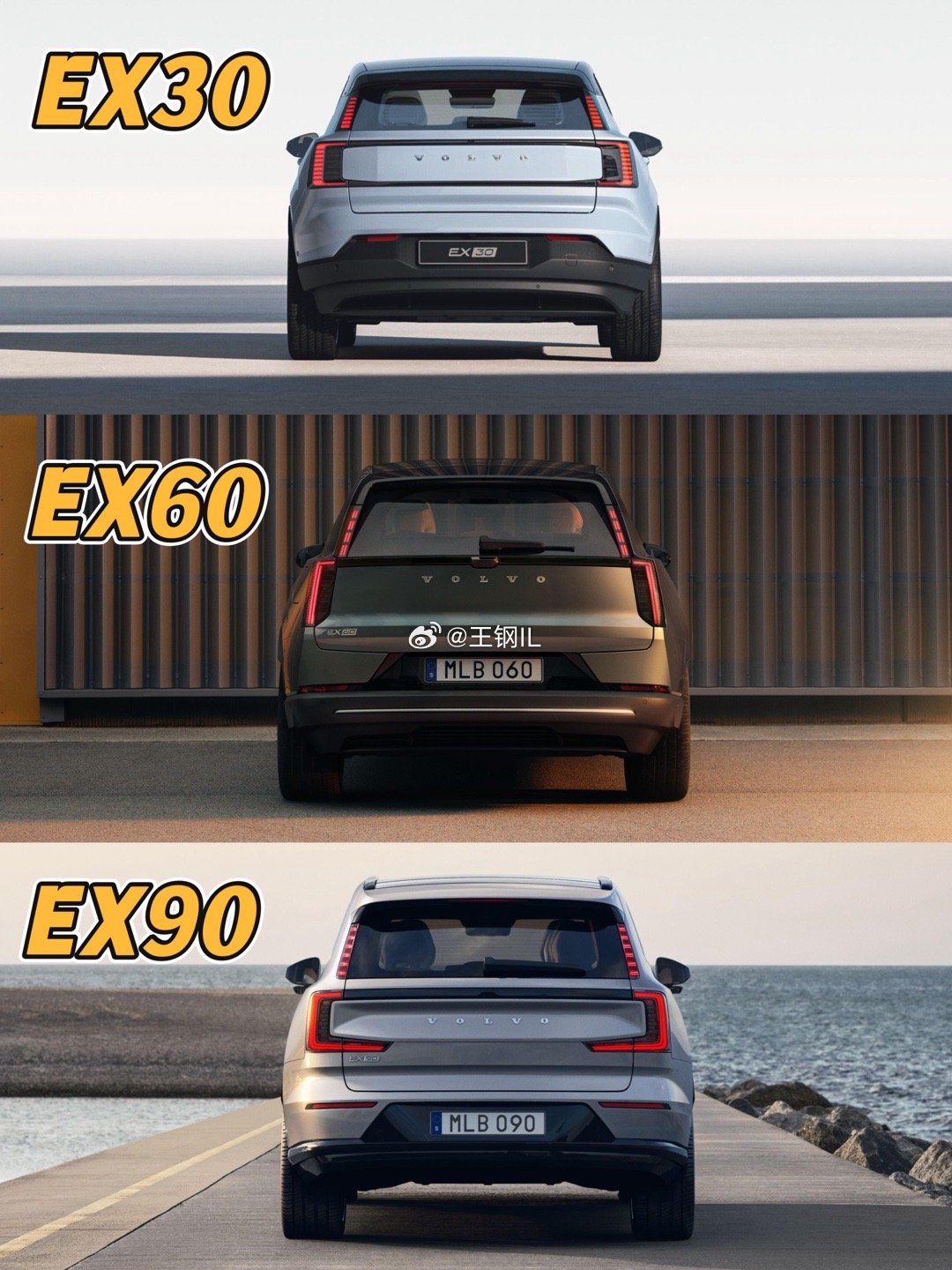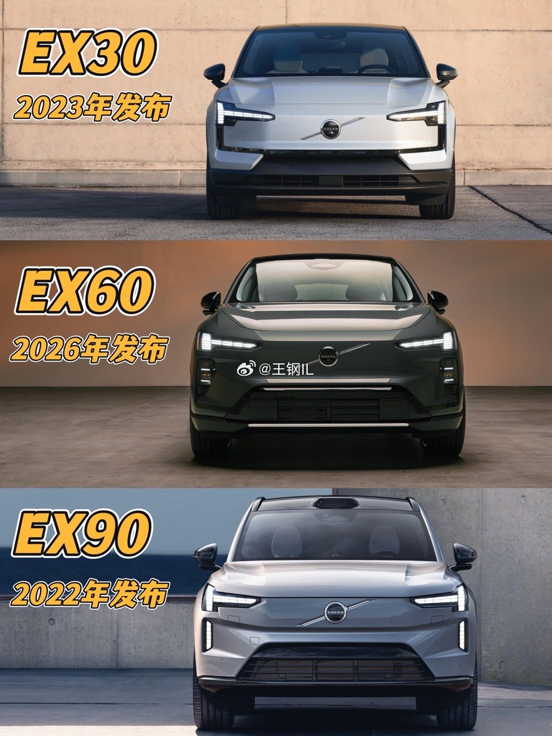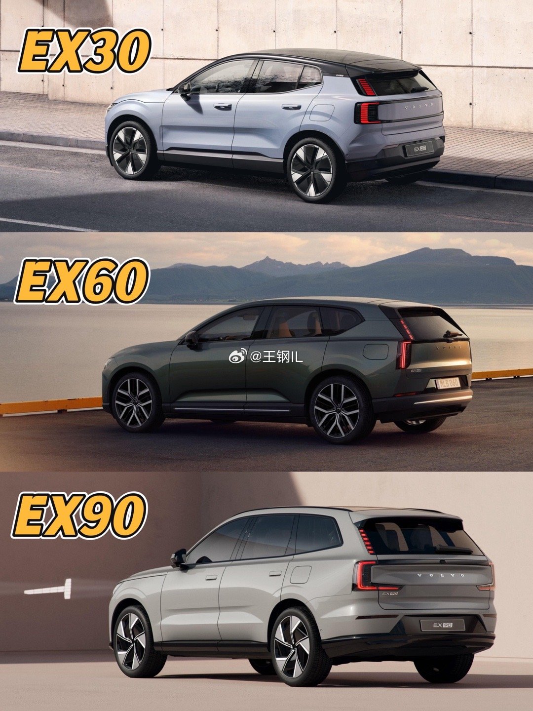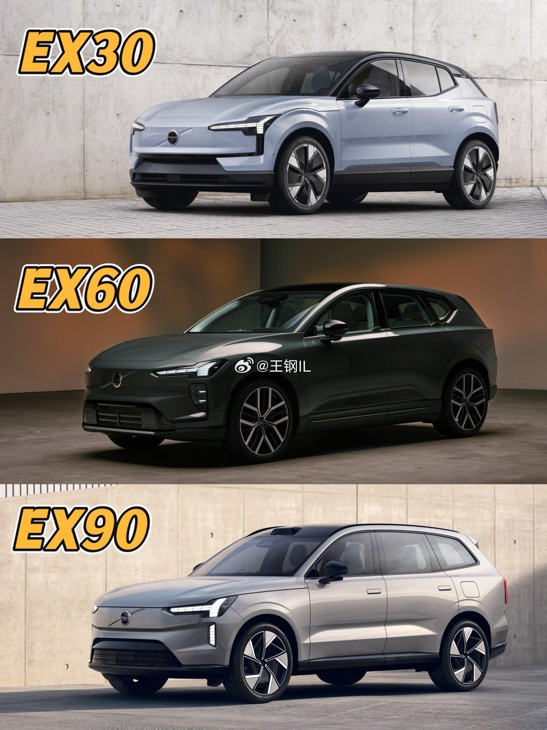沃尔沃EX系纯电SUV内外设计对比,沃尔沃EX纯电SUV家族目前已有四款车型,EX30/60/90都共享高度相似的内外设计风格,仅因应各自定位不同而在车身尺寸和比例上有差异。沃尔沃