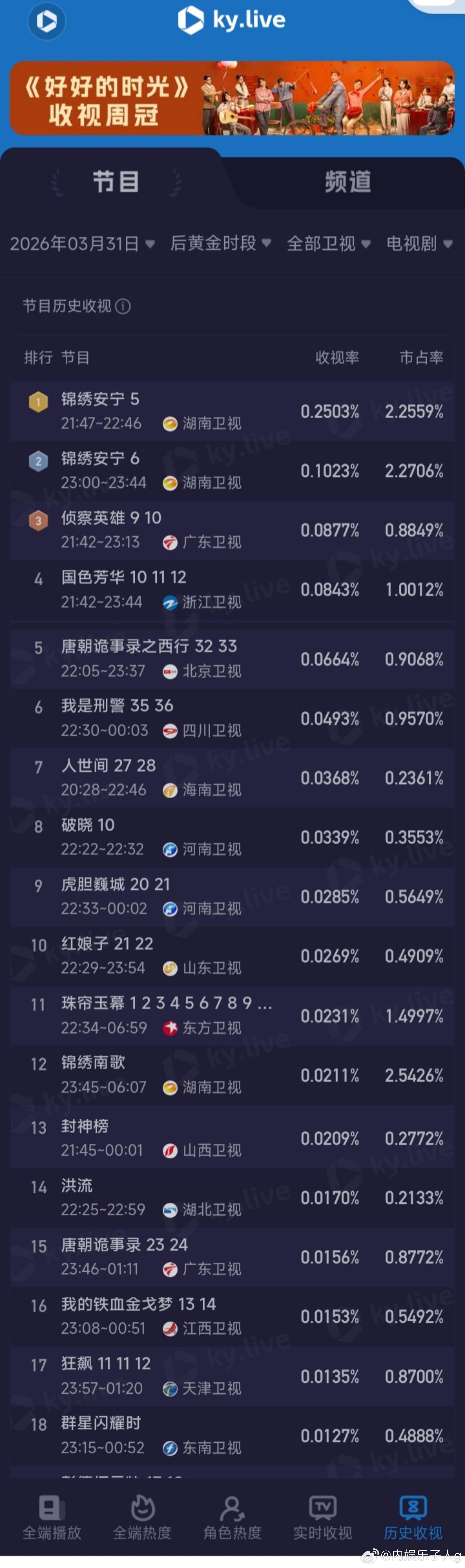张晚意2024年播出的《锦绣安宁》,晚上九点半后重播,每天都是次黄档酷云卫视同期第一。不仅上了CVB日榜TOP10,重播的次黄档比很多黄金档收视率都高。张晚意男主剧上星剧高,上星收视都很不错啊