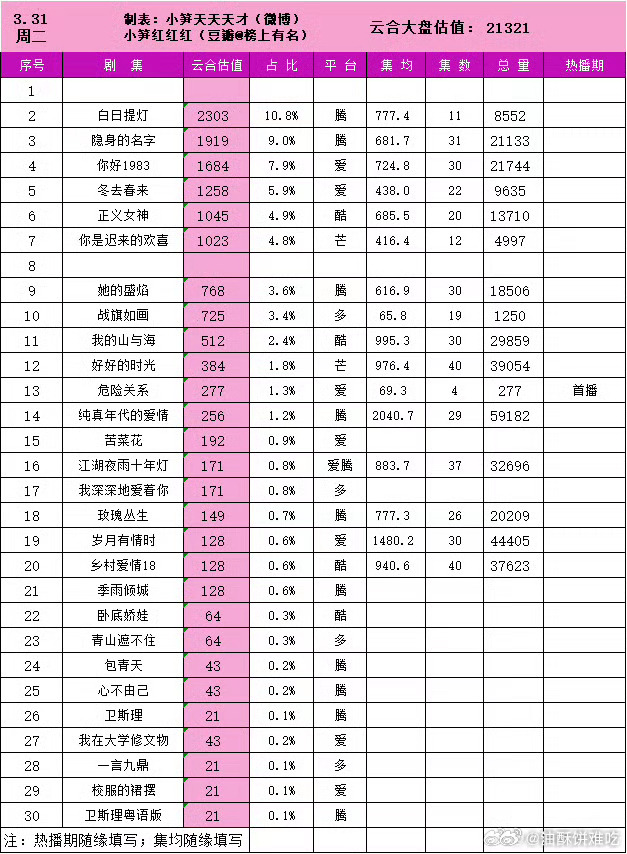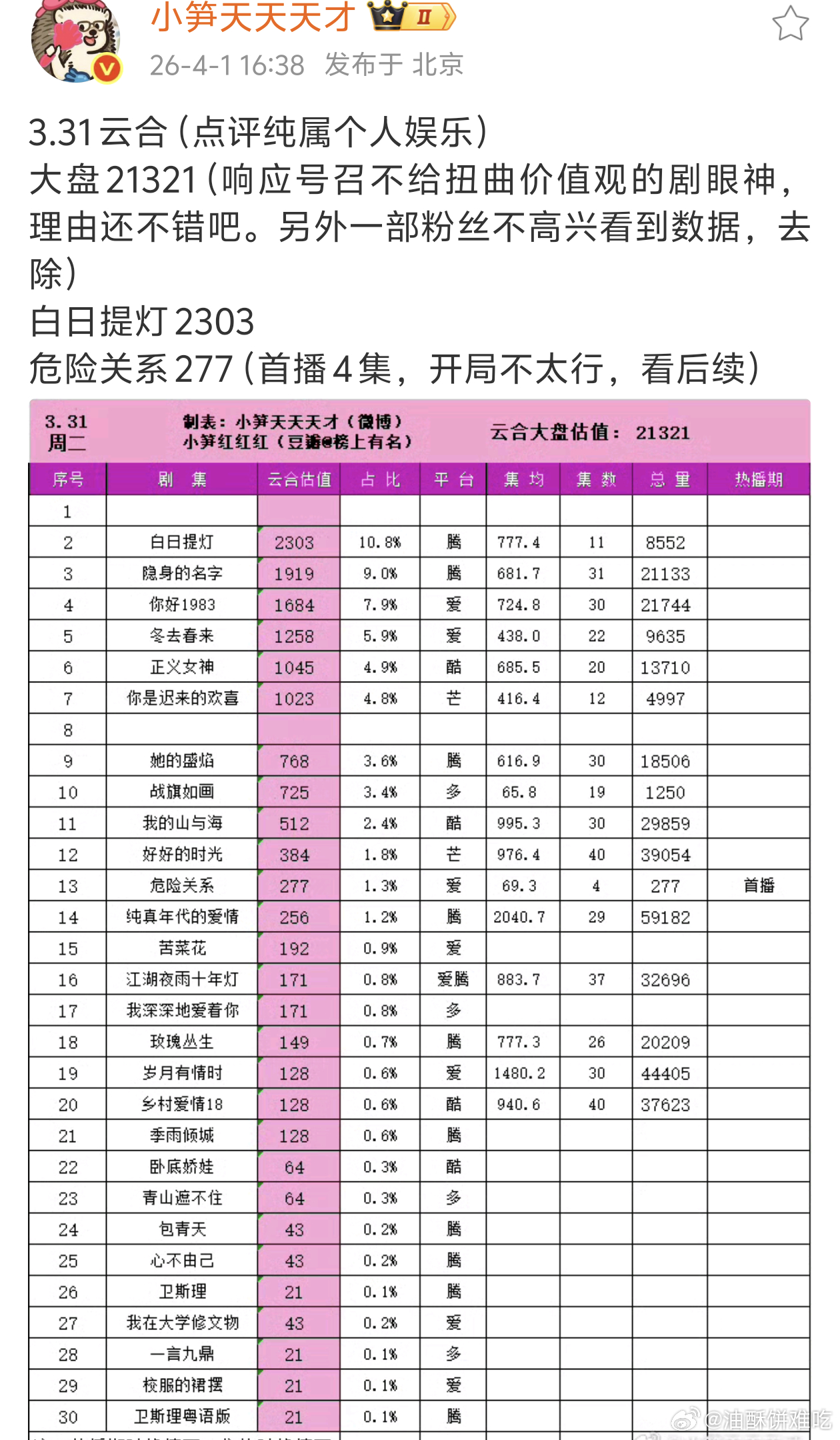 数据博主正确对待扭曲价值观电视剧的态度↓之前明月标红,现在小笋直接抹了