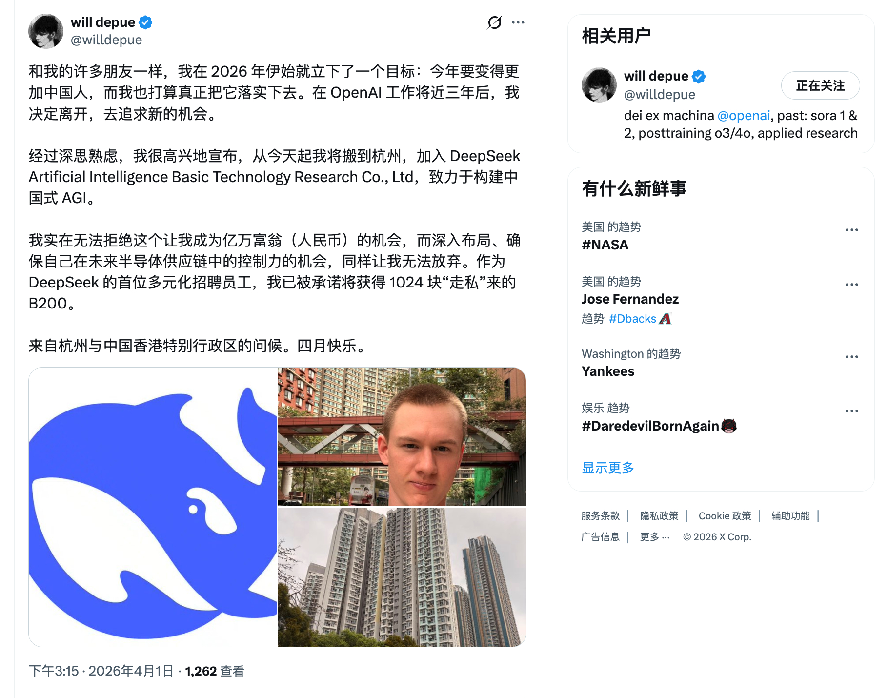 老哥从 OpenAI 离职去 DeepSeek,用中文发了条帖子。