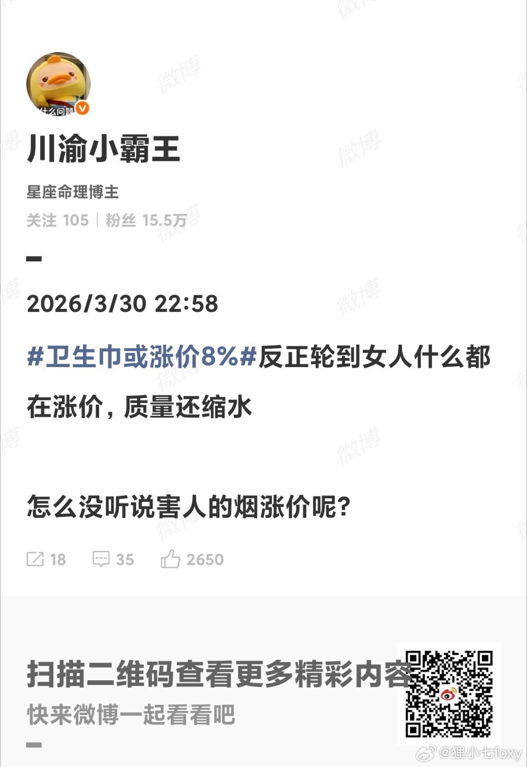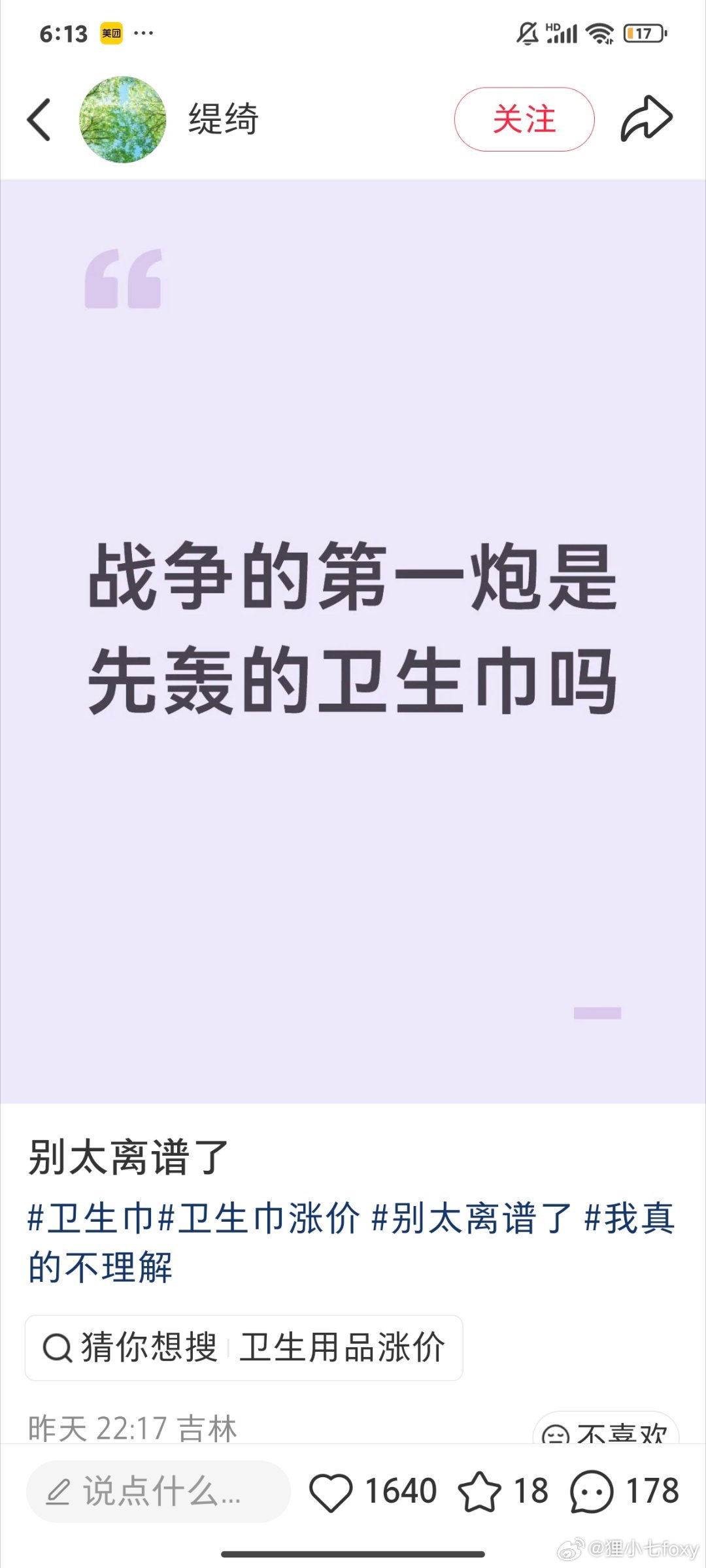 真的什么神人都有,战争的第一炮轰的是人命,最大的受害者是交战区的平民,不是你的卫生巾。卫生巾涨价也是受战争客观影响,拿自己的消费涨价碰瓷战火里的苦难,这都不能简单说是精致利己主义了,毫无人性,连一个完整的人都算不上 类似的发言其实还真不少,战区的平民在遭受惊恐和死亡,她们的眼里只有为消费品多花的那仨瓜俩枣。