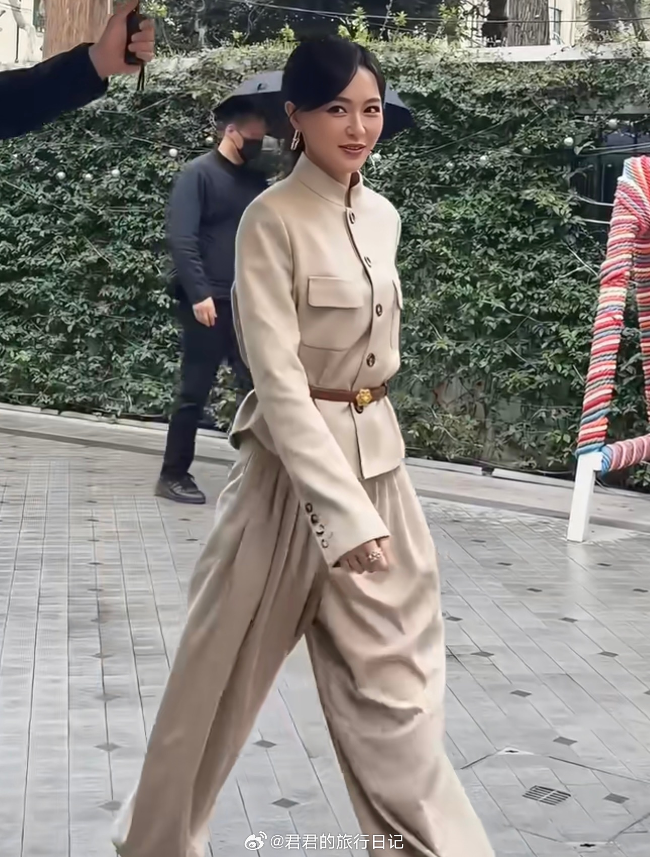 3月31日,唐嫣参加上海时装周活动入场画面曝光,一只手插兜,自己不打伞有保安打伞