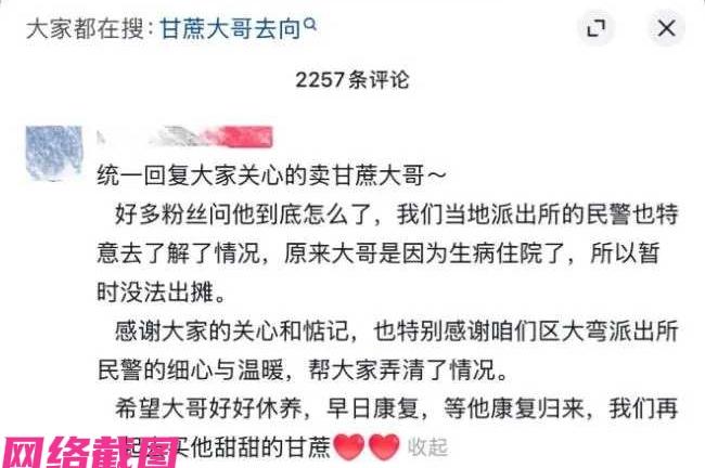 四川成都有男子发现自己家楼下,有个三轮车上装着甘蔗,但见得三轮车从过年开始就一直闲置,车上的甘蔗都干瘪成棍也没有看见摊主的来到,于是男子发布寻人启事来找找三轮车甘蔗摊主。 此刻男子担心三轮车甘蔗摊主是不是遇到事了,怎么连自己的三轮车甘蔗摊子都不置理,肯定背后一定有事,不然不会让自己的摊位荒废,竟然数月过去连人都看不到身影,所然让人担心,于是出现男子的寻人启事。 这里男子的举动也引发众人的关注,甚至于引起民警的注意,最后还真的得到三轮车甘蔗摊主的回应,自己是生病住院了,人在医院躺着,所以也顾不上这里三轮车还有上面的甘蔗,还答复谢谢大家的关心。 可见这样一件简单的事,在众人眼里却变得温馨,让平凡的事在众人的烘托之下有了温度,有了关心,看见美好的时光流淌之下的灿烂,暖人心。