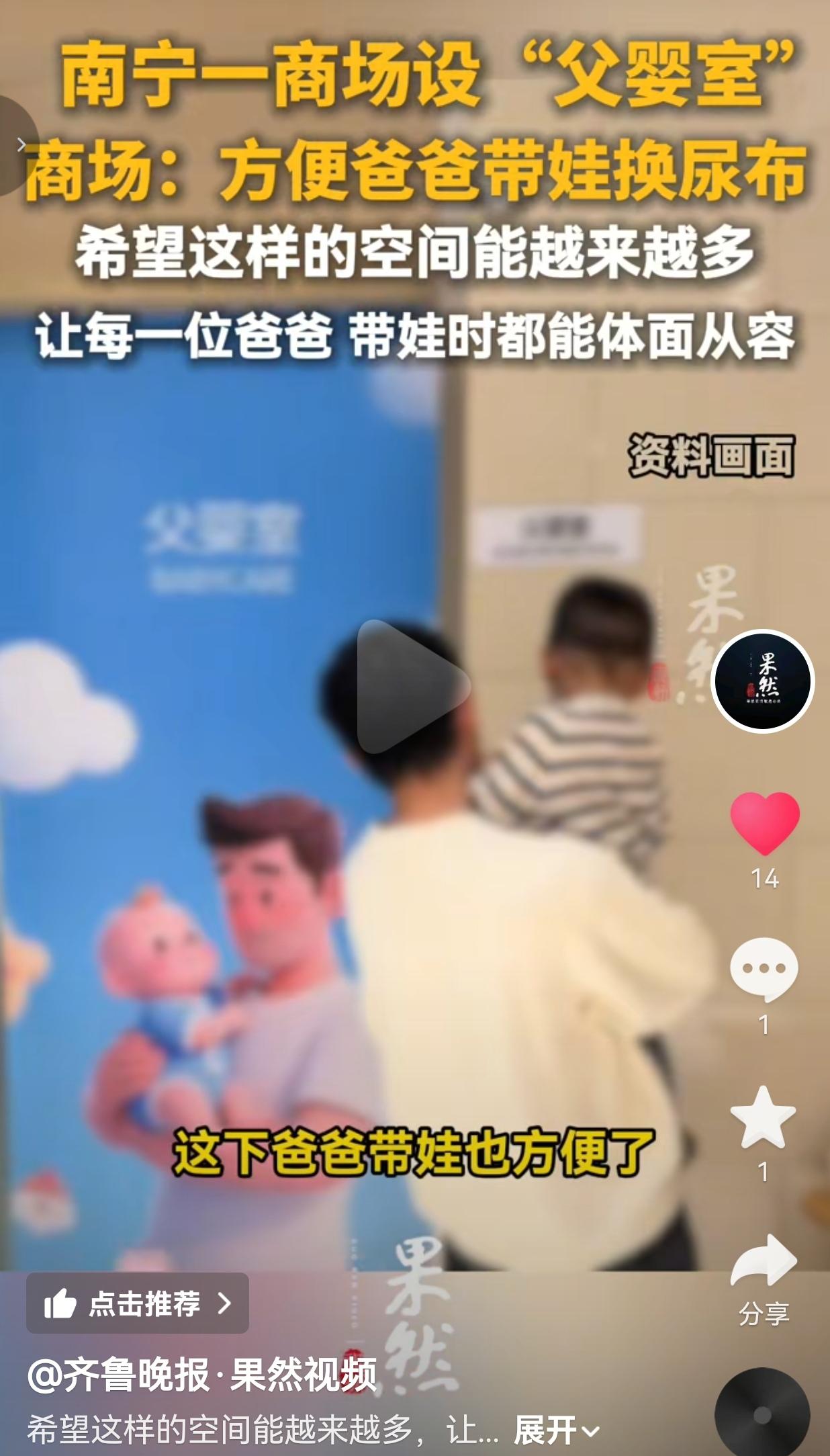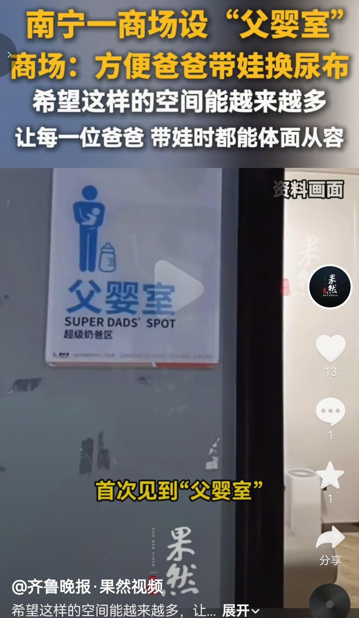 南宁商场设“父婴室”火了!爸爸带娃终于不用再尴尬,这才是真正的人性化! 事情是这样的:南宁华成都市广场,专门增设了独立的“父婴室”,和传统母婴室完全分开,避免使用冲突。 里面配齐了护理台、尿布台,就是为了方便爸爸单独带娃的时候,能体面、从容地给孩子换尿布、冲奶粉。 商场工作人员说了,就是考虑到现在很多爸爸会单独带娃出门,母婴室里妈妈们要喂奶、换衣,爸爸进去太尴尬,也不方便,所以专门开辟了这个空间,让爸爸带娃也能有专属的、不尴尬的地方。 消息一出来,全网爸爸直接破防了!多少爸爸带娃出门,孩子拉了尿了,只能在卫生间、甚至大街上硬着头皮换,要么就是硬闯母婴室,被人用异样的眼光盯着,尴尬到脚趾抠地! 现在好了,有了专门的父婴室,爸爸带娃再也不用狼狈,再也不用尴尬,终于能体面地带娃了! 网友看到后评论说:“终于懂我们了!上次带娃出门,娃拉了,母婴室全是妈妈,我在卫生间蹲地上给娃换,尴尬到想找地缝!” 也有的网友说:“太支持了!我老公每次单独带娃,最头疼的就是换尿布,有了父婴室,我再也不担心他带娃出门尴尬了!” 还有的网友说:“这才是真正的人性化!带娃从来不是妈妈一个人的事,爸爸也需要被看见、被尊重!” 说实话,多少人默认带娃就是妈妈的事?多少商场只设母婴室,完全忽略了爸爸带娃的需求?多少爸爸单独带娃出门,只能在卫生间、在大街上、在众目睽睽之下,狼狈地给孩子换尿布,还要承受别人异样的眼光? 爸爸带娃,从来不是“帮忙”,是责任,是义务,是爱!可我们的社会,却一直没给爸爸带娃足够的尊重和便利! 南宁这家商场,做的不仅仅是一个父婴室,更是对“爸爸带娃”这件事的认可,是对所有奶爸的尊重! 它告诉我们:带娃不是妈妈一个人的事,爸爸也需要被看见,爸爸带娃也需要体面,也需要便利! 更难得的是,这个父婴室不是摆样子,是真的实用!有护理台、有尿布台,完全满足爸爸带娃的需求,不是为了蹭热度,是真的为奶爸们着想! 这才是真正的人性化服务,这才是真正的好商场! 我们总说要性别平等,要尊重爸爸的育儿权,可真正的平等,从来不是喊口号,是体现在这些细节里! 是给爸爸一个不尴尬的换尿布的空间,是让爸爸带娃也能体面,也能从容,也能被尊重! 这件事,根本不是一个父婴室的事,是整个社会对爸爸育儿权的认可! 毕竟带娃的路上,爸爸从来不是局外人!今天南宁这家商场开了个好头,希望未来有越来越多的商场、车站、机场,越来越多的公共场所,都能设父婴室,都能看见爸爸带娃的需求,都能给爸爸带娃足够的尊重和便利! 让每一个爸爸,带娃的时候,都能体面、从容,不再尴尬,不再狼狈! 最后,我想说的是:带娃从来不是妈妈的独角戏,给爸爸体面,才是真正的育儿平等! 对此,你怎么看?