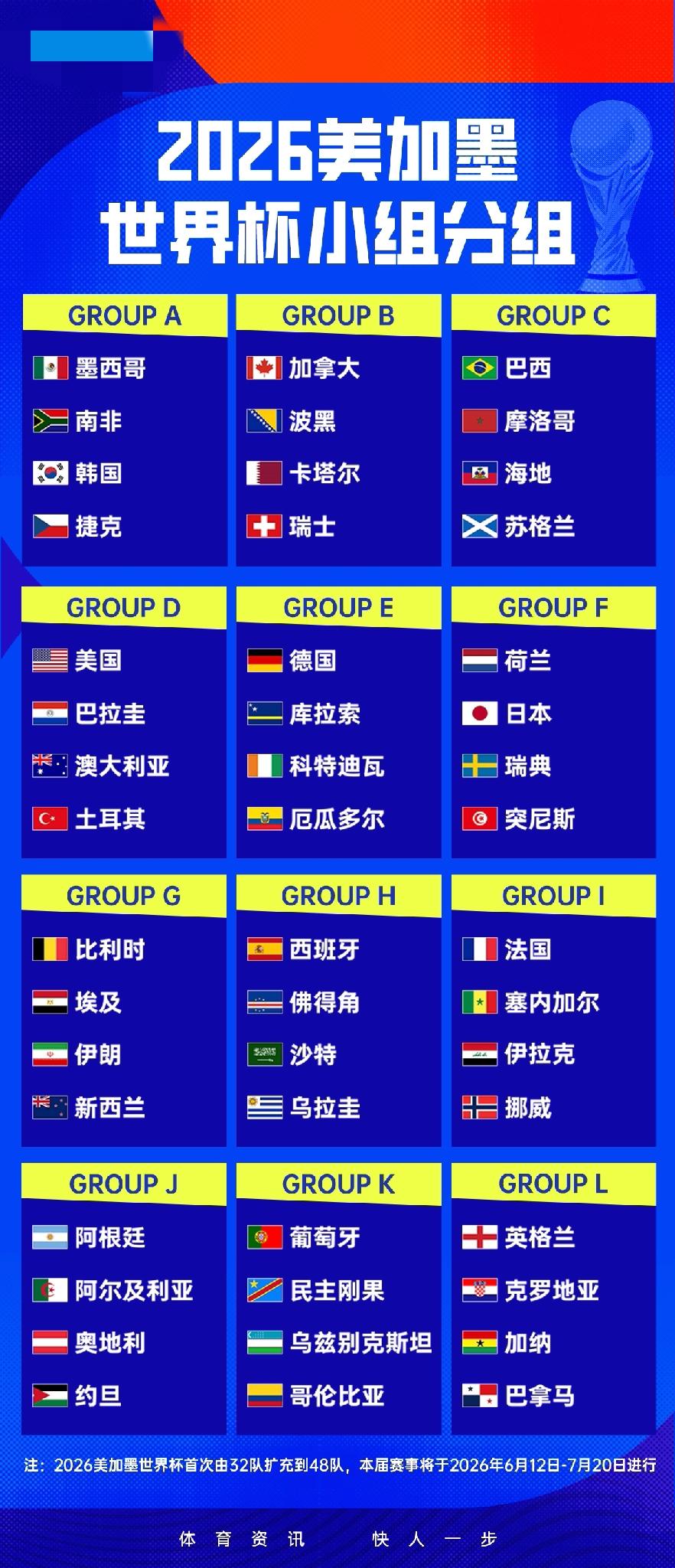 2026美加墨世界杯小组赛赛程:6月12日3点揭幕战墨西哥vs南非,6月17日9点阿根廷首战阿尔及利亚 04月01日 2026美加墨世界杯,随着伊拉克时隔40年重返世界杯!48支参赛球队全部出炉,赛程也一并揭晓。具体赛程如图 6月12日揭幕战凌晨3点打响,墨西哥vs南非 6月15日 4:00小组赛荷兰对阵日本 6月17日9点小组赛阿根廷首战对战阿尔及利亚 6月18日葡萄牙1点首轮对阵民主刚果 6月27日 08:00小组赛乌拉圭vs西班牙 6月27日挪威vs法国的焦点大战将在进行