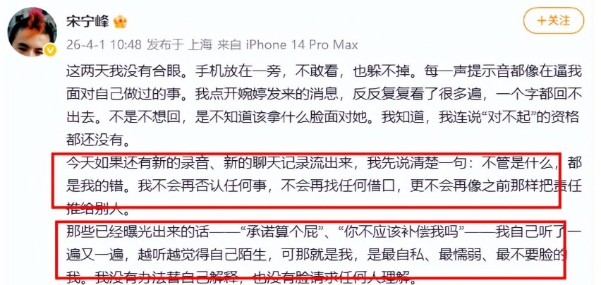 演员宋宁峰承认婚内出轨,无限期暂停所有演艺工作。 他就算不出来表态,大家也不知道他是谁啊!是暂停工作还是本来也没工作? 打个比方一个人不是很出名,但是他在大街上裸奔,当然就会有很多人注意到了。 演艺界那些臭事,多不胜数。恶心事,少宣传,正确引导!