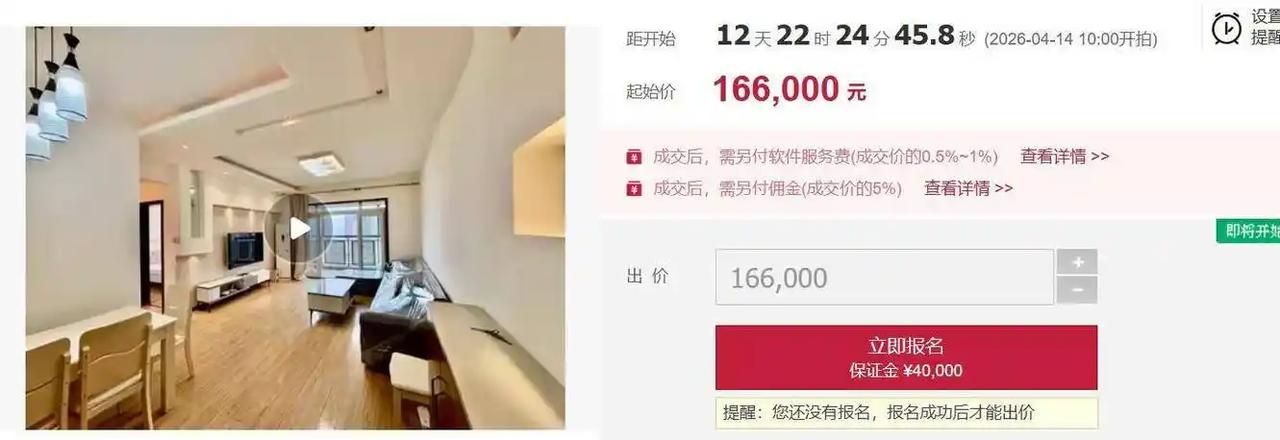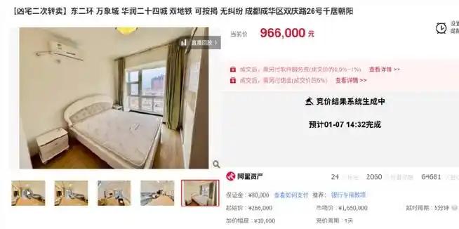 2026年4月1日,阿里拍卖平台挂牌成都市成华区双庆路某小区一套住宅房产,该房源建筑面积为89.7平方米,属精装地铁房,因房屋内发生过非正常死亡事件,被标注为“凶宅”,此次挂牌为该房产第三次拍卖,起拍价定为16.6万元。 该房产此前已历经两次拍卖流程:2025年11月首次拍卖,最终以105.6万元的价格成交,该价格显著低于彼时该房源160万元的市场评估价值;2026年1月开展第二次拍卖,新竞得人以96.6万元价格成功竞拍,后因竞得人资金问题未能履约完成交易,其缴纳的5万元保证金依规定被没收。 本次拍卖活动定于2026年4月14日正式启动,截至2026年4月1日,已有3名竞拍人完成报名,1395人设置拍卖提醒,房源围观量达到25023次。据拍卖方披露,因前次拍卖成交后未完成产权过户手续,故将该房产重新上架拍卖,本次起拍价格较前两次26.6万元的起拍价,已进行大幅下调。