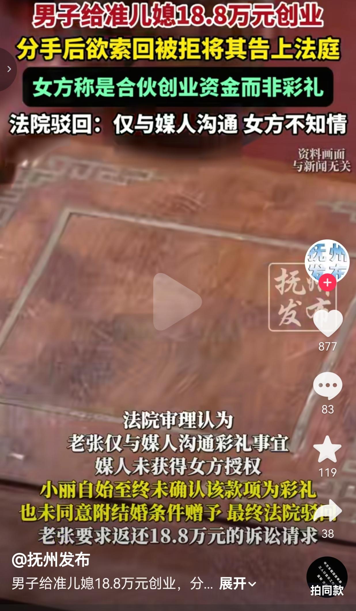 给准儿媳18.8万创业,分手起诉要回被法院驳回!这钱到底该不该还? 一准公公自己私下跟媒人定的“彩礼”,没跟女方说清楚,分手了就想把钱要回来,法院直接给你怼回去,这才叫大快人心! 事情是这样的:江苏泰州的老张,为了促成儿子小张和准儿媳小丽的婚事,听了媒人的话,给小丽转了18.8万,说是让她开乐器培训机构创业。 老张和媒人私下里认定,这笔钱就是彩礼,可从头到尾,老张没跟小丽提过一句“这是彩礼”,小丽也从来没明确同意过以结婚为前提收这笔钱,只当是合伙创业的启动资金。 后来俩人分手了,老张直接翻脸,要求小丽把18.8万全额返还,小丽当然不同意,说这是创业钱,不是彩礼。老张直接把小丽告上了法庭,非要把钱要回来。 结果法院审理后,直接驳回了老张的全部诉求!给出的理由是:老张只跟媒人沟通了彩礼事宜,媒人根本没拿到小丽的授权,小丽自始至终都没确认过这笔钱是彩礼,也没同意过附结婚条件的赠与,所以老张的诉求完全不成立! 网友看到后评论说:法院判得太对了!你自己跟媒人定的规矩,凭啥让女方买单?没跟人说清楚就敢转钱,分手了就想要回,怎么想的? 也有的网友说:这就是典型的“自嗨式彩礼”!自己脑补是彩礼,女方根本没认,分手了就想耍无赖,法院这一巴掌扇得好! 还有的网友说:支持小丽!创业钱就是创业钱,凭啥分手了要还?要是男方说这是彩礼就是彩礼,那女方说这是赠与就是赠与,哪有这种道理? 说实话,我真的越看越气!这哪是给准儿媳创业钱?这分明是老张自己的一场“自嗨式彩礼”操作! 他以为听媒人的话,给了钱,就等于把婚事定死了,就等于把女方绑死了?他从头到尾,有没有跟小丽沟通过一句“这笔钱是彩礼”?有没有问过小丽愿不愿意以结婚为前提收这笔钱? 没有!完全没有!他就是想当然地认为,我给了钱,你就该嫁给我儿子,分手了就该把钱吐出来! 真当女方是没有话语权的附属品?真当婚姻是一场钱货两清的买卖? 更可笑的是,他把所有希望都寄托在媒人身上,以为媒人能代表女方,可媒人算什么?媒人能替女方做决定吗?能替女方签合同吗? 法院判得太对了!法律只认双方明确的意思表示,不认你私下跟第三方的自嗨!你没跟女方明确约定是彩礼,没拿到女方的同意,那这笔钱就不是彩礼,就是赠与,就是创业资金,分手了女方凭什么还? 我们总说彩礼是习俗,可习俗的前提是双方自愿、明确约定!不是你男方单方面想当然,不是你给了钱就可以绑架女方的婚姻! 更不是你家长替儿子做决定,替儿子定彩礼,连跟女方沟通都省了! 婚姻是两个人的事,是两个年轻人的事,不是家长和媒人的交易! 老张的操作,本质上就是把婚姻当成了买卖,把女方当成了商品,以为18.8万就能买到一个儿媳妇,分手了还能退货退款,简直是滑天下之大稽! 这件事给所有家长都提了个醒: 别再搞这种“自嗨式彩礼”了!别再替儿子做决定了!别再把婚姻当成买卖了! 彩礼要给,必须是双方明确约定,必须是女方自愿接受,必须是白纸黑字说清楚! 你私下跟媒人定的,不算数!你自己脑补的,不算数! 法律不保护你的想当然,只保护双方明确的权利义务! 今天法院驳回老张的诉求,就是给所有想靠彩礼绑架婚姻的人,一个最响亮的耳光! 最后,我想说的是:婚姻不是买卖,彩礼不是绑架,自嗨式的彩礼,法律永远不会买单!