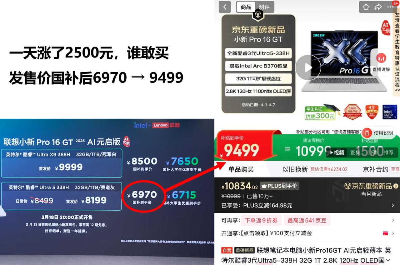 家人们谁懂啊,联想小新Pro GT这波涨价真的把套路玩明白了!首发的时候用6970的国补低价冲销量、攒口碑,把热度炒起来之后,反手就给全线涨价,最高直接涨了3000块! 半个月不到涨两千多,这哪是卖电脑啊,这是把消费者当韭菜割呢?涨价之后同配置完全没了竞争力,真心劝大家别上头,不如老老实实等荣耀2026款新品,不搞这些花里胡哨的套路。