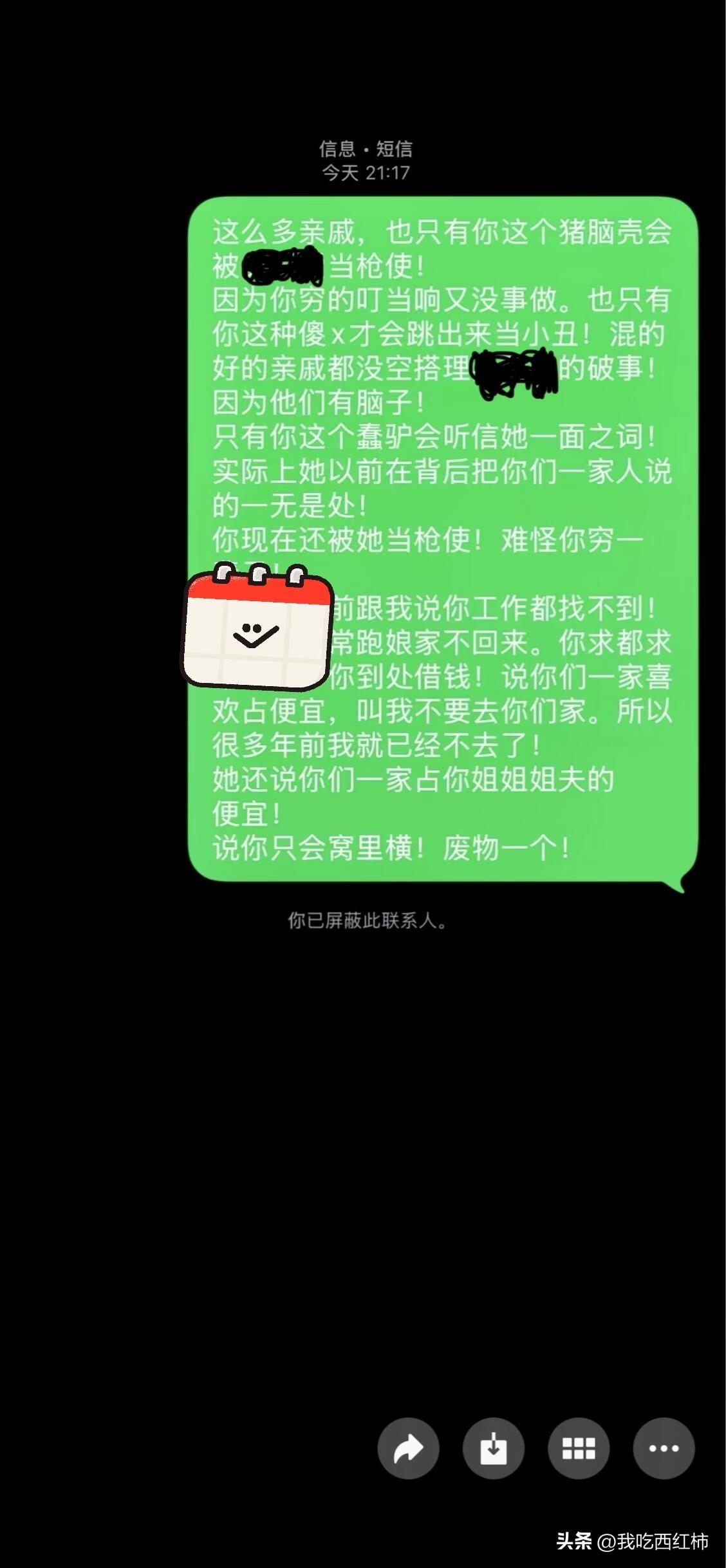 亲妈拉黑我三年,还要霸占我的房子后续 你们敢信吗? 我那个为了5万块彩礼拉黑我、霸占我房子9年的亲妈,图一是我发给她的,她根本不敢回我信息!竟然找了个远房表哥打电话来恐吓我。 打了五个,我都没接。但每次挂断之后他都用语音给我留言辱骂我。说我不敢接电话,还威胁要打我!说我不要认为自己很有本事。赚了点钱有什么了不起。他说他最瞧不起的就是我。说比我赚钱多的老板多的是!(可能因为我十多年没去过他家走亲戚,而且我是所有亲戚里面混的最好的那个!估计是他内心非常嫉妒我)我跟这个表哥从来没联系过,没有微信没有电话。我根本不屑搭理他。因为他是一个连工作都找不到的穷鬼。快50岁了。一无所有。到处借钱过日子。老婆不知道跑了多少次。他们家天天吵的鸡飞狗跳。也不知道他是怎么还有脸来骂我的。还说别人家的孩子都想着如何孝敬父母。(实际上他一辈子都在啃老。正式工作都没找到过。偶尔打点零工,他住的房子是他父母盖的)一个一无是处的男人!还说他这辈子最擅长的就是吵架和打架,说如果我是他家的人,一天要打我三顿! 2. 图二是我回复他的短信,发完就拉黑了!我还发了五条朋友圈骂他。所有亲戚都能看到。应该会转告他。他没有我的微信。 我对那个表哥说:“你以为你是来帮亲戚的?其实你在她眼里只是个‘穷得叮当响、没脑子的枪手’。 我打算1号回去。这个远房表哥可能想来搞事情从中获利!很可能是我妈借了钱给他。所以他才这么来劲!因为他是亲戚里面最穷的那个。我妈随便给点好处就能收买他。让他来出面。你们觉得我回去怎么应对比较好? 比如我去撬门,我妈可能在家。随后就叫来亲戚威胁恐吓要打我,甚至真的动手打我!是回去硬碰硬,还是想点其他法子比较好!大家说一下我这个该怎么解决?