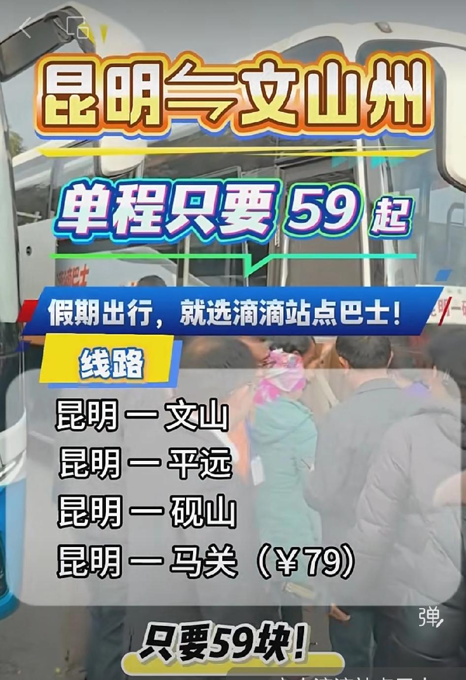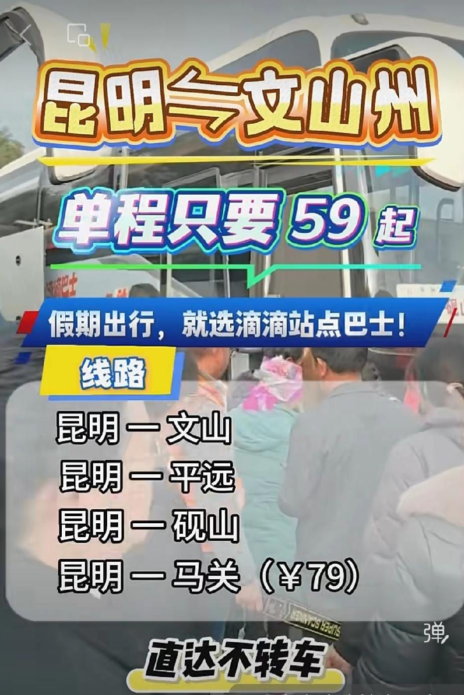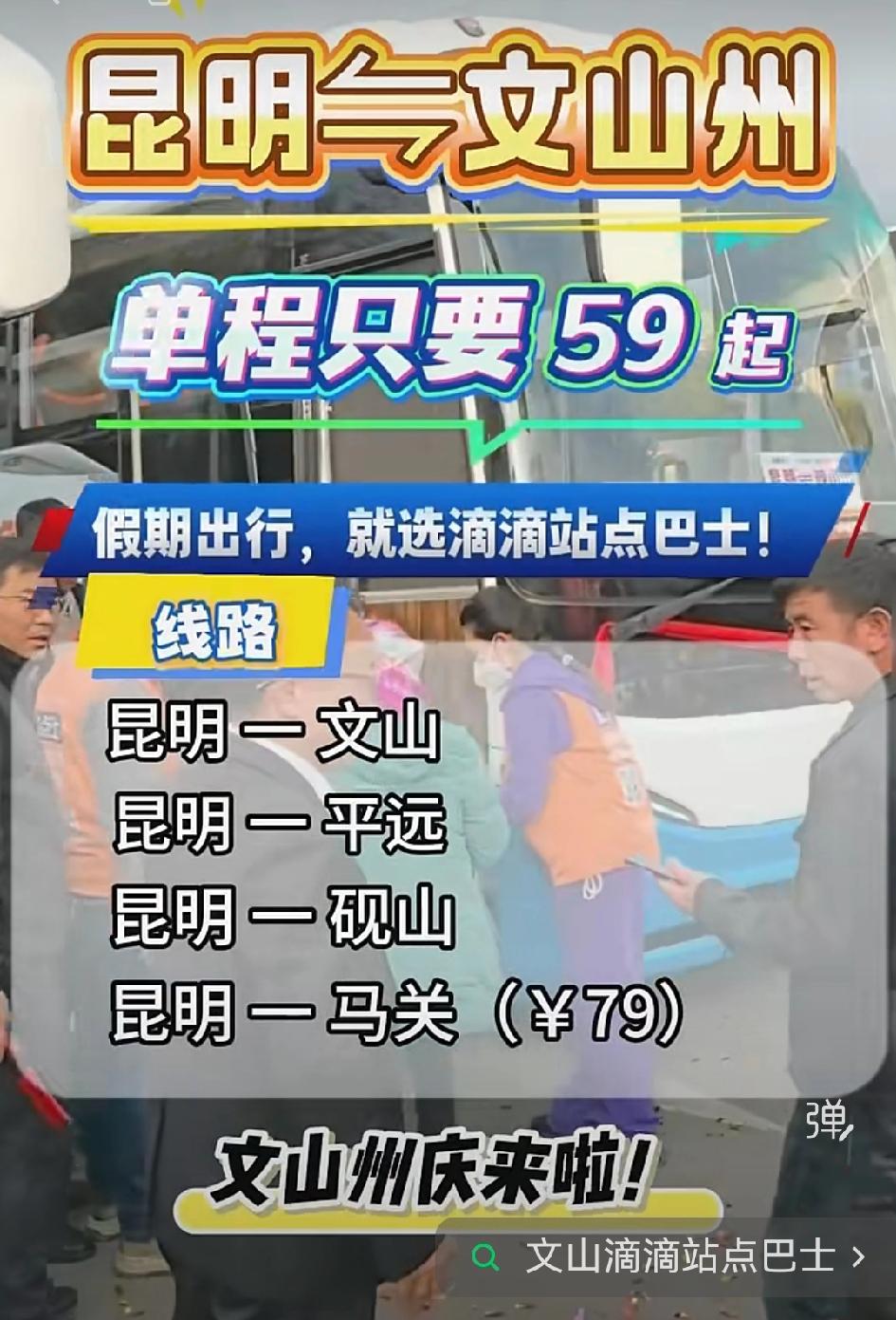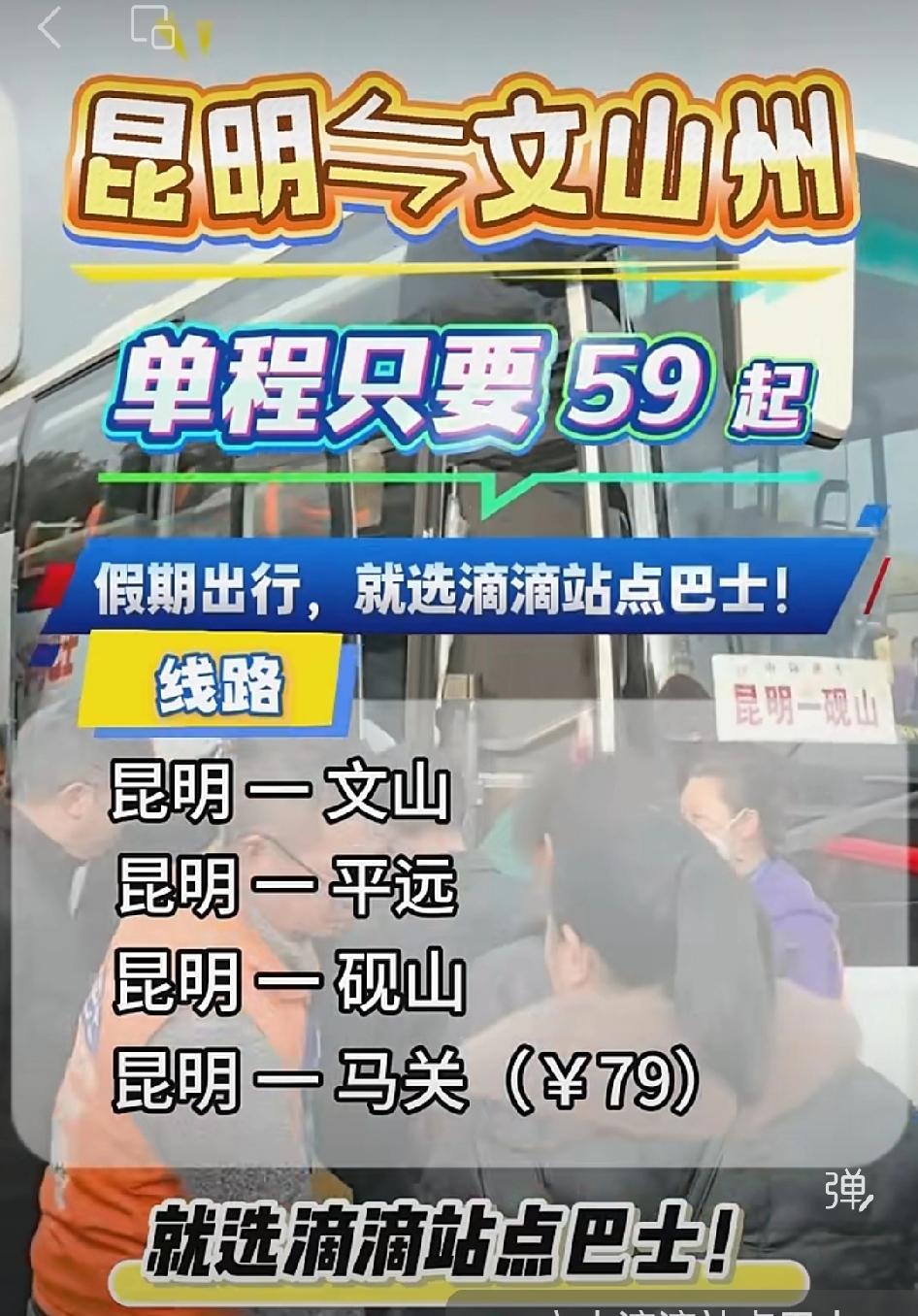 【昆明→文山站点巴士只需59元起】 文山州庆连休 6 天,这简直是妥妥的假期福利![福][福][福] 想去文山游玩的朋友们可有福啦。从昆明到文山,乘坐站点巴士只需 59 元起,而且直达无需转车,还能准时发车。乘坐正规巴士出行,既安全又省心。 从车次网信息可知,昆明到文山的车次众多,07:20 到 15:00 均有车可乘,票价大多在 117 元左右,车程约 4 小时。比如从昆明市东部汽车客运站出发的车次就不少,不同车型的价格存在差异。 如此优越的出行条件,大家不妨趁着州庆假期,赶紧前往文山感受当地的独特风情!