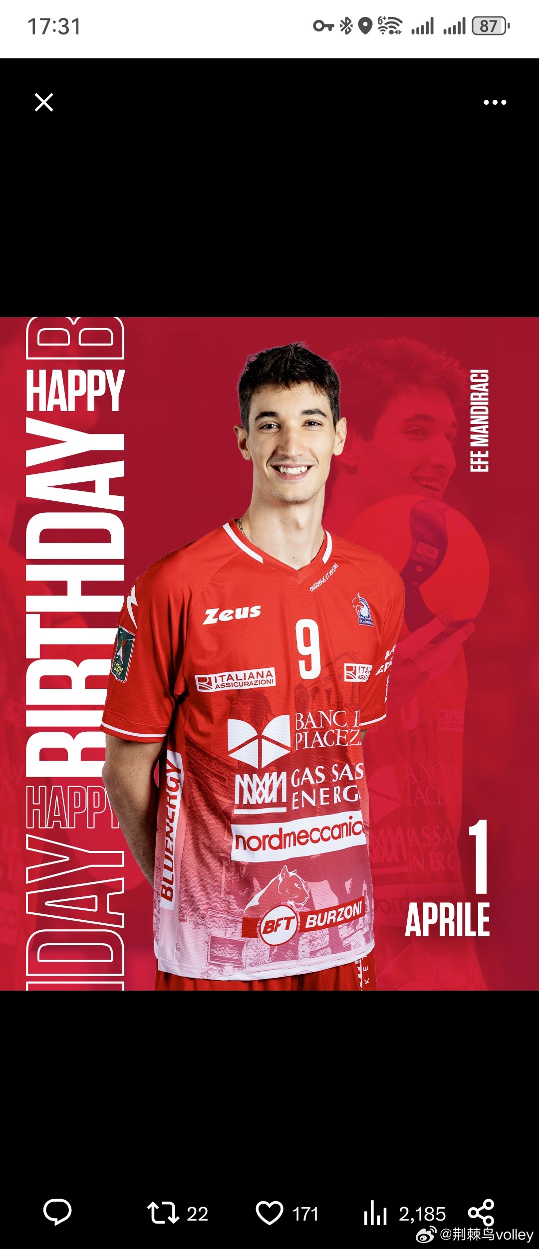 今天4月1日,是身高206CM的土耳其一哥曼迪拉奇24岁生日,祝生日快乐。男排国