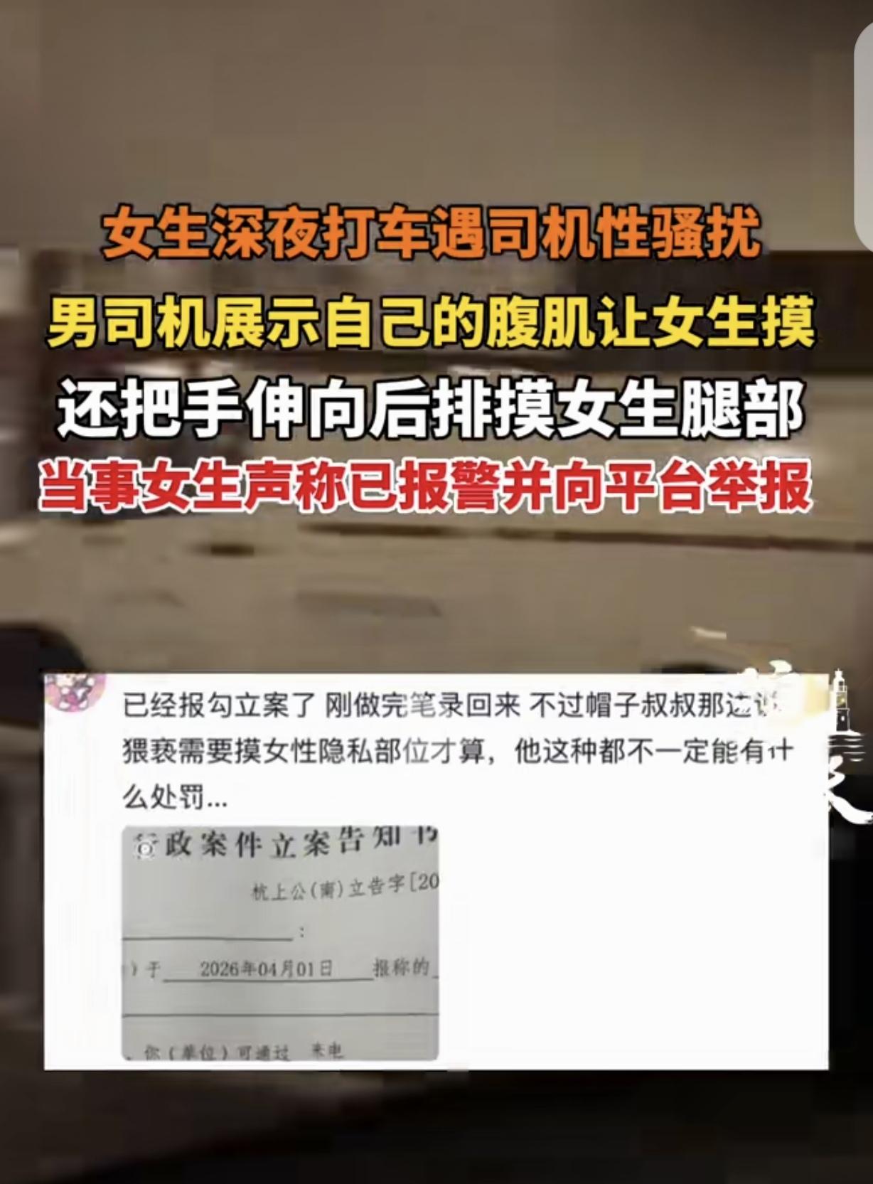 浙江,一女子深夜打车,她留了个心眼,坐在了后排,不料,男司机不但撩起衣服,让女子摸他腹肌,还把手伸到后排摸女子的腿,可把女子吓得不轻,她尖叫一声,怒斥男司机:你干嘛?你好吓人呀。女子报警后,警方说猥亵需要摸女子隐私部位才算,男司机都不一定会受到处罚,女子傻眼了:难道他白摸了?这事就这么算了? 3月31日晚,一女子准备打车回家,路上没什么人,她拦了辆出租车,特意选了后排座位,想着这样能安全点。 毕竟大晚上的,而且是男司机,也不知道对方是什么样的人,坐的远一点对自己是个保护。 车刚开出没多远,司机就开始找话搭茬,问她在哪上班?平时几点下班?话还挺密。 女子有一搭没一搭地应着,不说话没礼貌,敷衍一下得了,她只想快点到家。 可没过多久,司机突然把衬衫往上撩,露出肚子,跟她说自己平时健身,腹肌练得有多好多好,让她摸自己的腹肌。 女子没接话,觉得这个司机咋这么没边界感?只觉得有点别扭,往车门边挪了挪。 让她没想到的是,司机见她没回应,竟然直接把手伸向后排,摸到了她的大腿上。 女子吓得瞬间尖叫起来,声音都变了调,厉声喝止司早干嘛?太吓人了。 司机手缩了回去,嘴里还嘟囔着开个玩笑至于这么大反应,脚下却加快了车速,没一会儿就把车停在了小区门口。 女子赶紧下车,心脏还砰砰跳个不停。冷静下来后,她越想越气,拿出手机报了警。 可民警的话却给她浇了一盆冷水。民警说,按照现行规定,猥亵行为一般需要是触碰隐私部位才算,司机摸大腿的行为,可能达不到处罚标准,最多只能批评教育。 女子听完傻眼了,明明自己被吓得不轻,司机的行为也明显越界了,怎么就不算违法呢? 女子查询了一下,得到的答复也差不多,目前法律对猥亵的界定确实比较严格,像这种触碰非隐私部位的行为,很难认定为猥亵,除非能证明司机有更严重的企图。 女子心里堵得慌,她觉得自己明明是受害者,却讨不到说法。 这件事在网上传开后,也引发了不少网友的讨论,很多人都觉得司机的行为太过分了,支持女子维护权益。 但法律就是这么规定的,只能认栽。不管怎么说,女子的经历都给大家提了个醒,深夜出行一定要多留个心眼,遇到不对劲的情况,第一时间保护好自己。 《治安管理处罚法》第44条规定,猥亵他人或在公共场所故意裸露身体,情节恶劣的,处五日以上十日以下拘留。 本案中,司机撩衣露腹、触摸乘客大腿的行为,虽没直接触碰隐私部位,但已突破社交边界,对乘客造成心理恐惧与冒犯,属于情节恶劣的骚扰。 骚扰的核心,是违背他人意愿的冒犯性接触,而不是只局限于隐私部位,应依据情节给予治安处罚,而非仅批评教育。 对此。你怎么看?