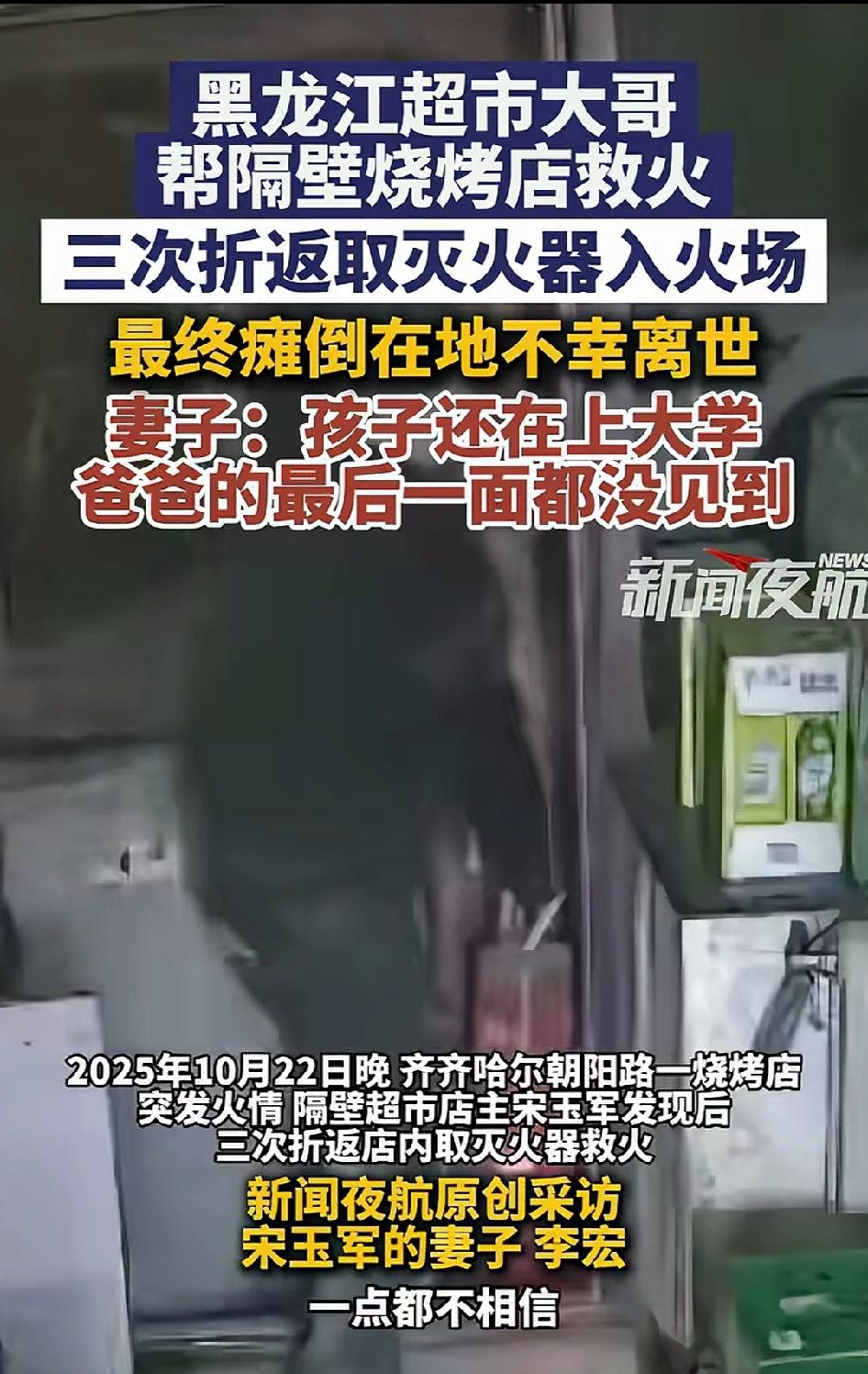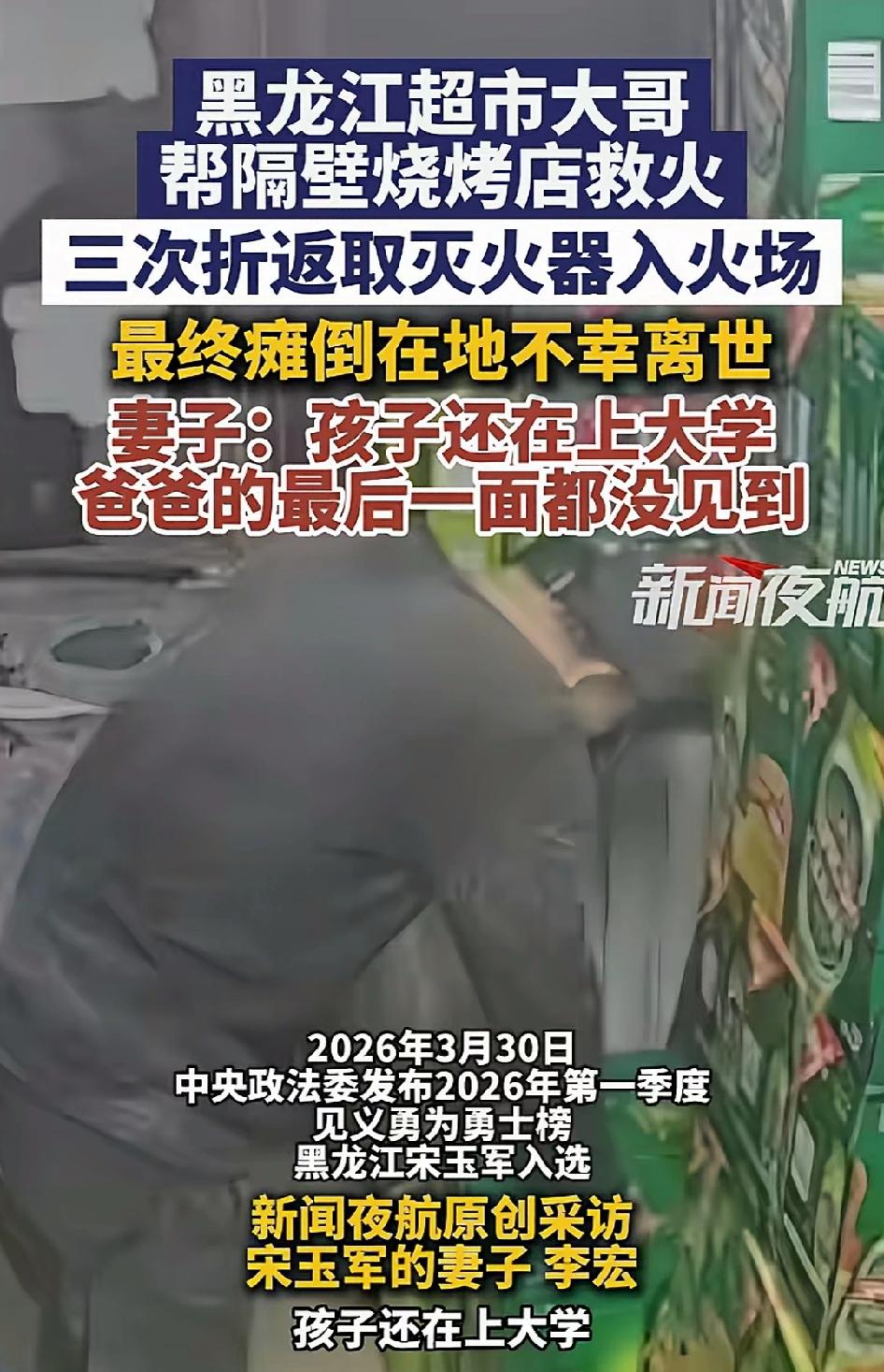2025年10月22日傍晚,黑龙江齐齐哈尔,天色刚暗下来,一隔壁烧烤店突然蹿出浓烟,刺鼻的气味瞬间飘满整条街。正在看店的宋玉军心里一紧,撂下手里的活就冲了出去。 他就是个普普通通的超市老板,不善言辞、老实本分,一辈子守着这间小店,起早贪黑、省吃俭用。上有老人要养,下有读大学的儿子要供,全家的担子都压在他一个人肩上。他比谁都惜命,比谁都清楚,自己不能倒。 可看到火越烧越猛,他想都没想,转身跑回超市,抱起两具灭火器就扎进浓烟里。 他对着火苗根部使劲喷,烟熏得他睁不开眼,嗓子火辣辣地疼,可他只想着:先把火压住,别烧了整条街,别伤到邻居。 灭火器很快用完,火势却没减。他没犹豫,又折返跑回店里拿。 这时候,他已经头晕胸闷,脚步发飘,浓烟呛得他直咳嗽,脸熏得漆黑,眼睛红得布满血丝。旁人劝他别去了,等消防来,他摇摇头,又冲了进去。 他心里明白危险,可他更怕火势蔓延,怕邻居们半生的家业化为灰烬,怕这条赖以养家糊口的街,一夜烧成废墟。 第三次,他抱着灭火器再次冲进火场。 这一去,再也没能走出来。 没走几步,他眼前一黑,一头栽倒在地,吸入的过量一氧化碳,瞬间夺走了他的意识。 等邻居们把他救出来送进医院,人已经深度昏迷。 妻子李宏疯了一样往医院赶,看着躺在病床上一动不动的丈夫,她瘫软在地,哭得撕心裂肺。她一遍遍喊他的名字,可他再也没有睁开眼,一句话都没留下。 最让人心碎的是,儿子还在外地读大学,接到噩耗赶回来时,父亲已经走了。 没能送最后一程,没能说上一句话,成了母子俩一辈子都过不去的坎。 他不是不怕死,只是善良压过了恐惧; 他不是不心疼自己,只是责任让他不能后退。 在街坊眼里,他从来都是热心肠。谁家有事喊一声,他都搭把手;谁家有难处,他能帮就帮。这次救火,不是一时冲动,是刻在骨子里的善良。 他守的不只是隔壁的店,更是整条街的安稳; 他冲的不只是一场火,更是普通人最朴素的道义。 2026年3月30日,中央政法委发布见义勇为勇士榜,宋玉军的名字赫然在列。 妻子含泪留言:“亲爱的老公,你永远是我心中的英雄。” 荣誉来得太迟,可他值得。 有人说他太傻,拿命去换一场不值得的勇敢。 可只有懂的人才知道,他不是傻,是本分、是良心、是刻在普通人身上的光。 他用生命护了邻里周全,却留给家人一生的思念与空落。 那个每天守在超市里、为柴米油盐奔波、盼着孩子成才的父亲,再也回不来了。 人间最痛,不过是英雄归尘,家人含泪; 人间最暖,却是平凡之人,行不凡之事。 宋玉军,你是整条街的英雄,更是一个家一辈子的骄傲。 愿天堂无灾无难,愿你的家人,被岁月温柔以待。 消息来源:网络公开内容,本文配图/视频素材来自网络,仅用于纪实分享与社会观察,如有侵权请联系删除,谢谢!