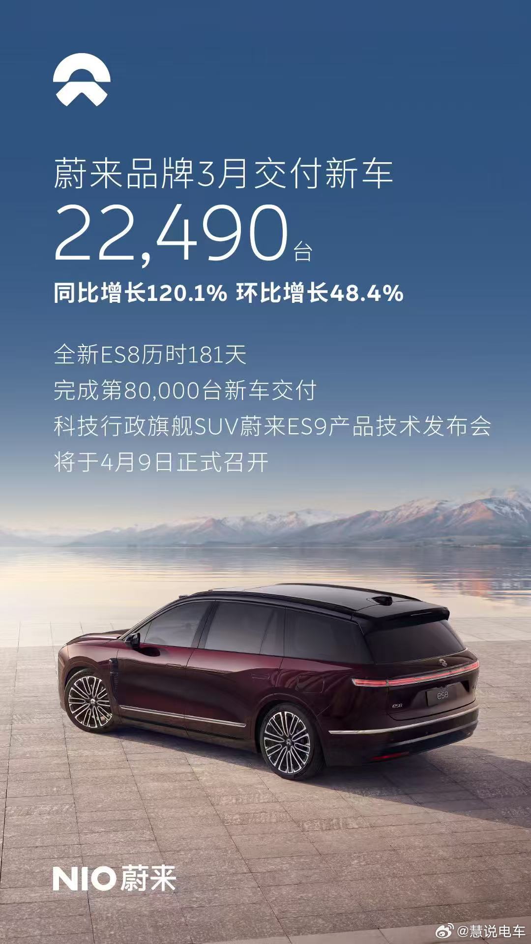 来来来,蔚来3月销量出炉了。非常亮眼,ES8交付了1万6千多台。2026年3月,蔚来公司交付新车35,486台,同比增长136.0%,环比增长70.6%。2026年一季度,蔚来公司共交付新车83,465台,同比增长98.3%,超财报交付指引上限。其中,蔚来品牌交付新车22,490台,同比增长120.1%,环比增长48.4%;乐道品牌交付新车6,877台,同比增长42.7%,环比增长130.7%;firefly萤火虫品牌交付新车6,119台,环比增长130.3%。截至目前,蔚来公司已累计交付新车1,081,057台。科技行政旗舰SUV蔚来ES9产品技术发布会将于4月9日正式举行。蔚来ES9是今年全球技术最先进的SUV,是蔚来技术从量变到质变的里程碑之作,也是蔚来体系创新的集大成之作。蔚来