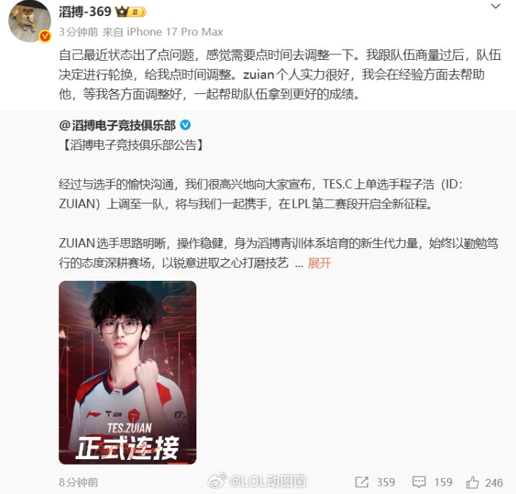 今日TES官宣ZUIAN上调一队,TES上单369对此进行转评,具体如下: