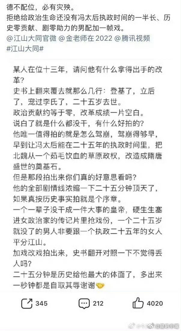 江山大同大女主改成大男主??先提前说下:魔改必扑!一个一辈子没干成一件大事的皇帝,硬生生塞进女政治家的传记片里抢戏份,一个二十五岁就没了的男人非要跟一个执政二十五年的女人平分江山。如果真的是这样魔改导致扑街是剧方应得的!反正杨幂不差爆剧!这一部就当做任务剧完成就行!(这剧还真的是任务剧)
