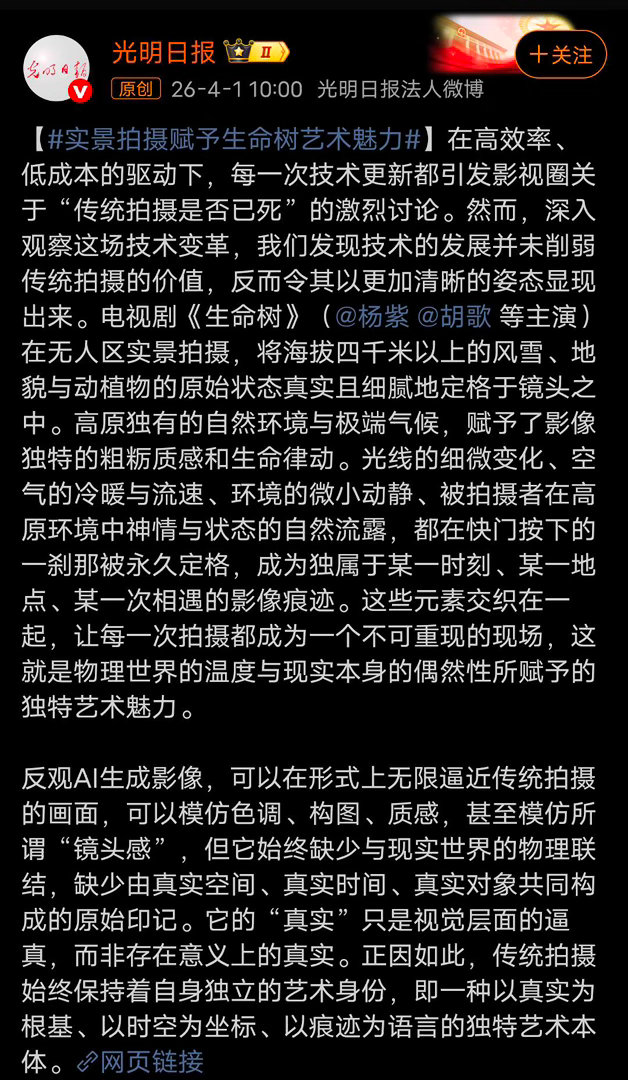 《生命树》用海拔四千米以上的无人区实景,把高原的风雪、地貌、生灵,把每一个不可复刻的真实瞬间,都永远定格在了镜头里。这才是影视创作最动人的底气,是AI永远无法替代的、来自现实本身的温度与力量。为实景拍摄的诚意之作喝彩,为杨紫、胡歌等主创的极致付出点赞!