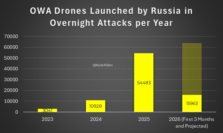 🔻俄军对乌克兰使用小摩托无人机的数量变化,目前即使是比较保守的估计,俄军每个月都对乌克兰放飞超过6000架小摩托,平均每天200架以上。🔻俄军的小摩托产能攀升大概用了2年时间,2026年预计月产能可以进一步提升到8000-10000架水平。🔻使用16单元抗干扰卫星定位天线耦合惯性导航的制导系统可靠性已经很高,美军连应付伊朗使用4单元抗干扰天线的伊朗小摩托都不怎么适应。这种产量巨大,航程又很远(可达2000公里)的螺旋桨无人机,确实是新时代的一个重要对地打击手段。