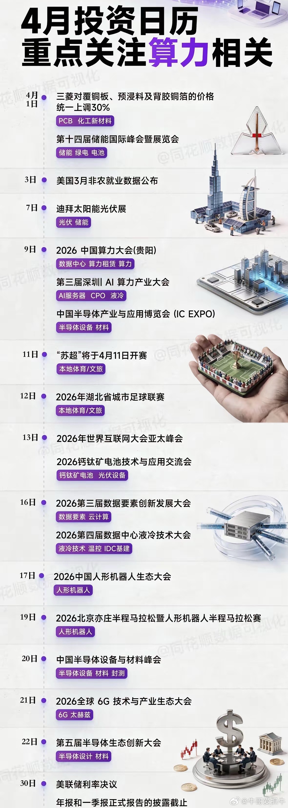 4月投资日历投资机会有算力,液冷,光伏,体育,机器人,6G。4月9日1。2026 中国算力大会(贵阳)2。第三届深圳| AI 算力产业大会3。中国半导体产业与应用博览会 4月16日1。2026第三届数据要素创新发展大会2。2026第四届数据中心液冷技术大会随着词元调用的增大,算力板块机会大增。对此你怎么看?