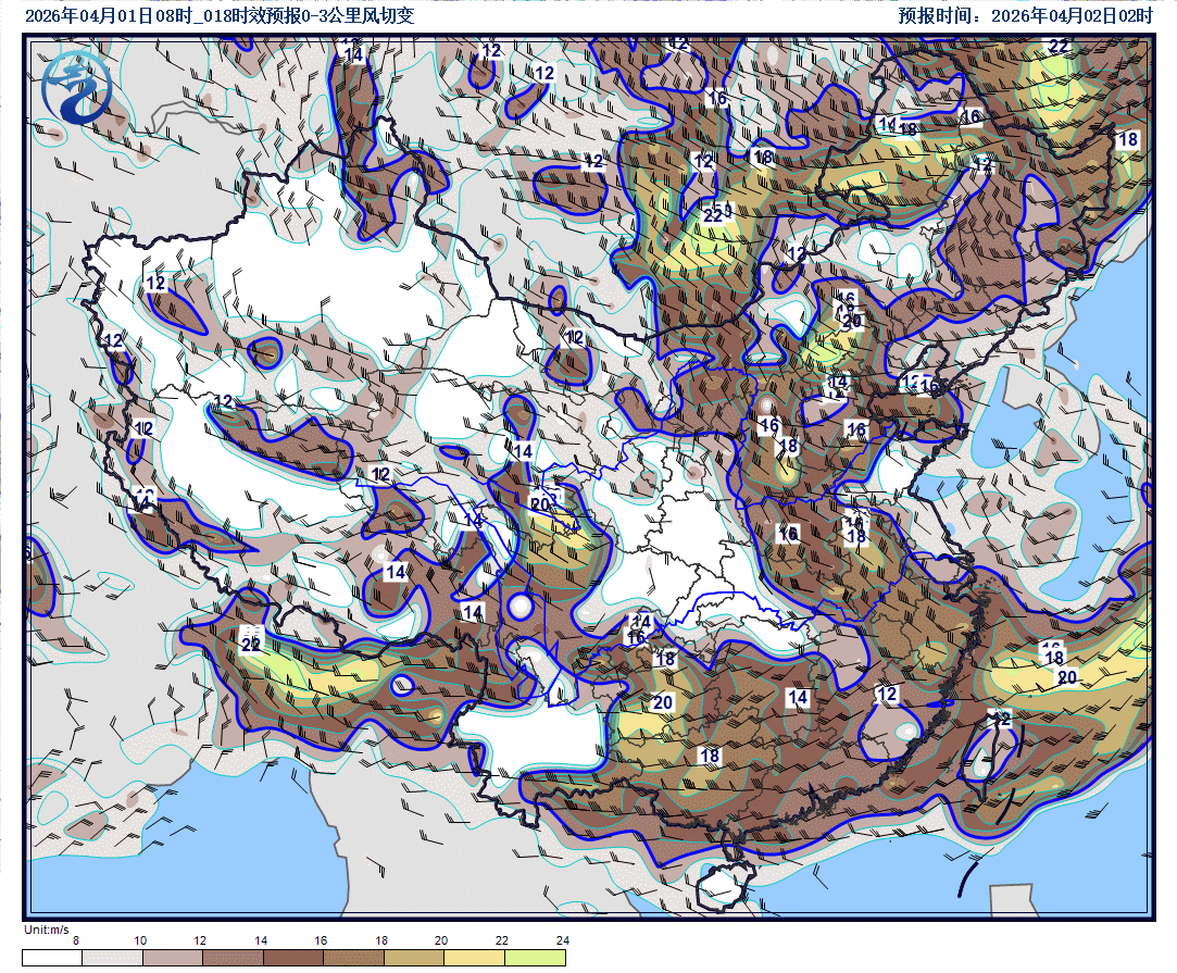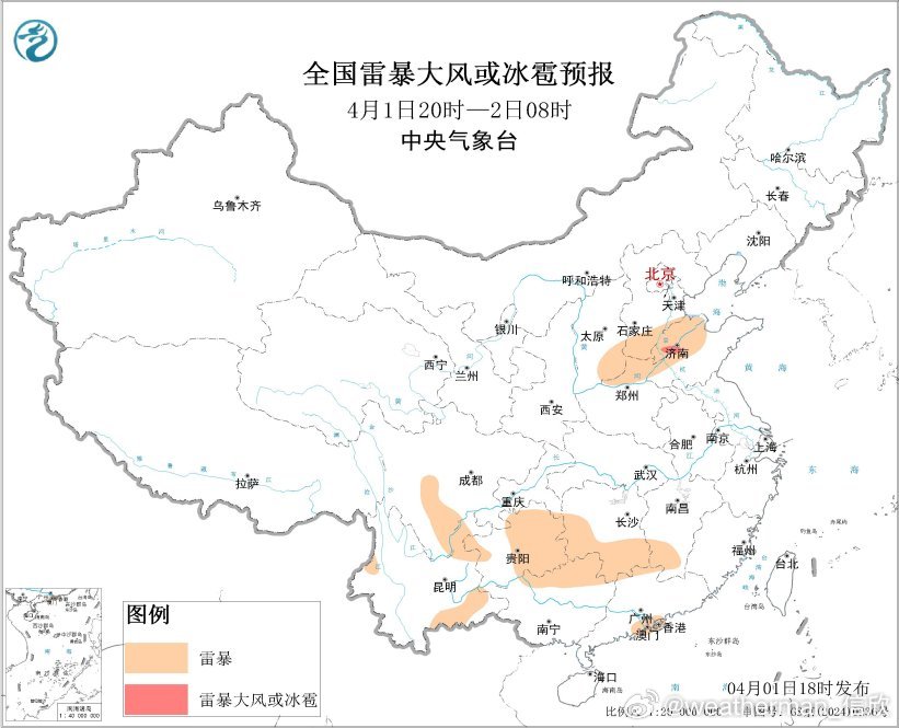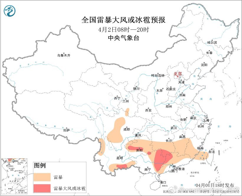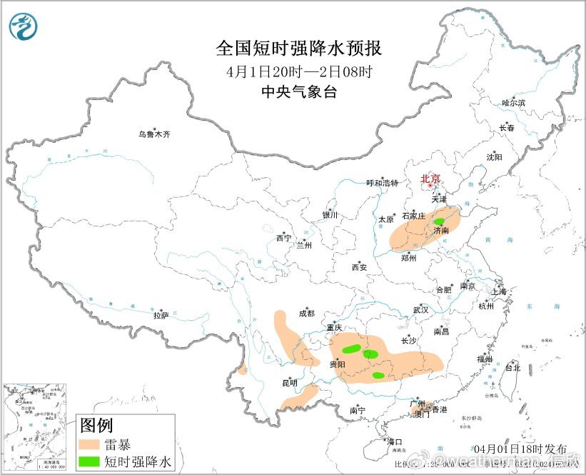预计4月1日20时至2日20时,贵州中东部、湖南南部和西部、江西中南部、福建西部、广西东部、广东西北部、山东北部等地的部分地区将有短时强降水天气,小时雨量20-30毫米,局地可达40毫米以上;另外,湖南南部、贵州中西部和东南部、云南东南部、广西东部、广东西北部、山东西北部等地的局地将有雷暴大风或冰雹天气。