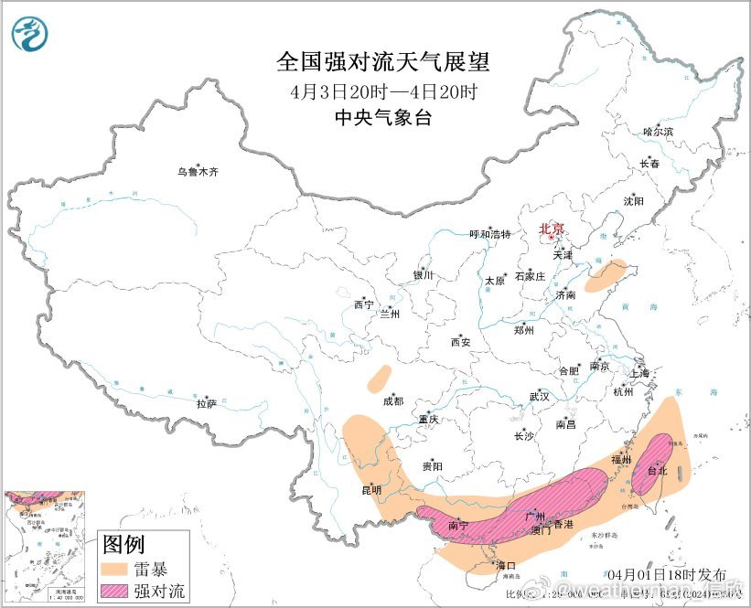预计4月3日20时至4日20时,江西南部、福建南部、广西南部、广东、台湾岛中北部等地的部分地区将有强对流天气。低空有偏东风和偏南风的冷切变,强对流可能更多为短时强降雨。广东广西在高空槽底,中层有干冷气流,低空有暖湿气流的配置下,也可能出现雷暴大风或冰雹。