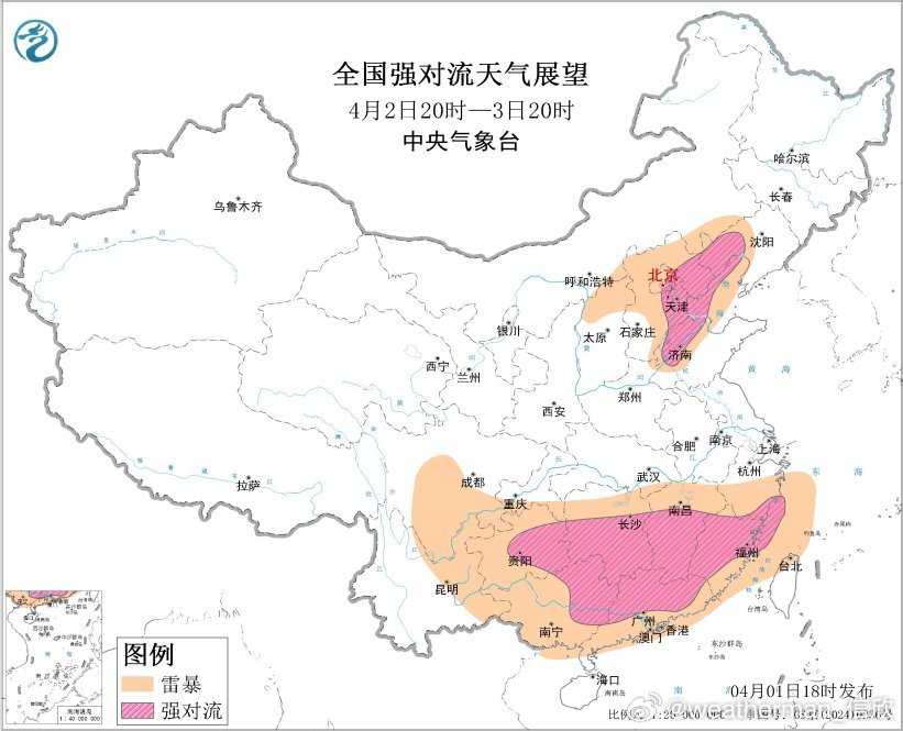 预计4月2日20时至3日20时,辽宁西部、河北东部、北京东部、天津、山东中北部、湖南中南部、江西中南部、浙江南部、福建、贵州中东部、广西东部、广东中北部等地的部分地区将有强对流天气。对流的种类很多,短时强降雨、雷暴大风、冰雹可能都有。