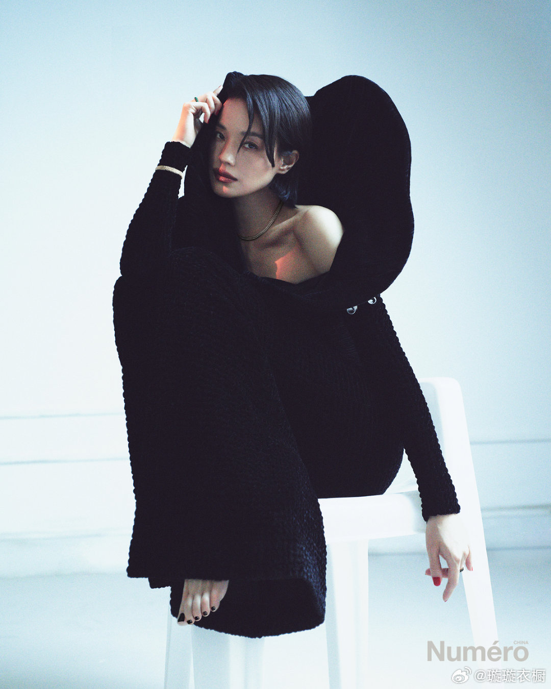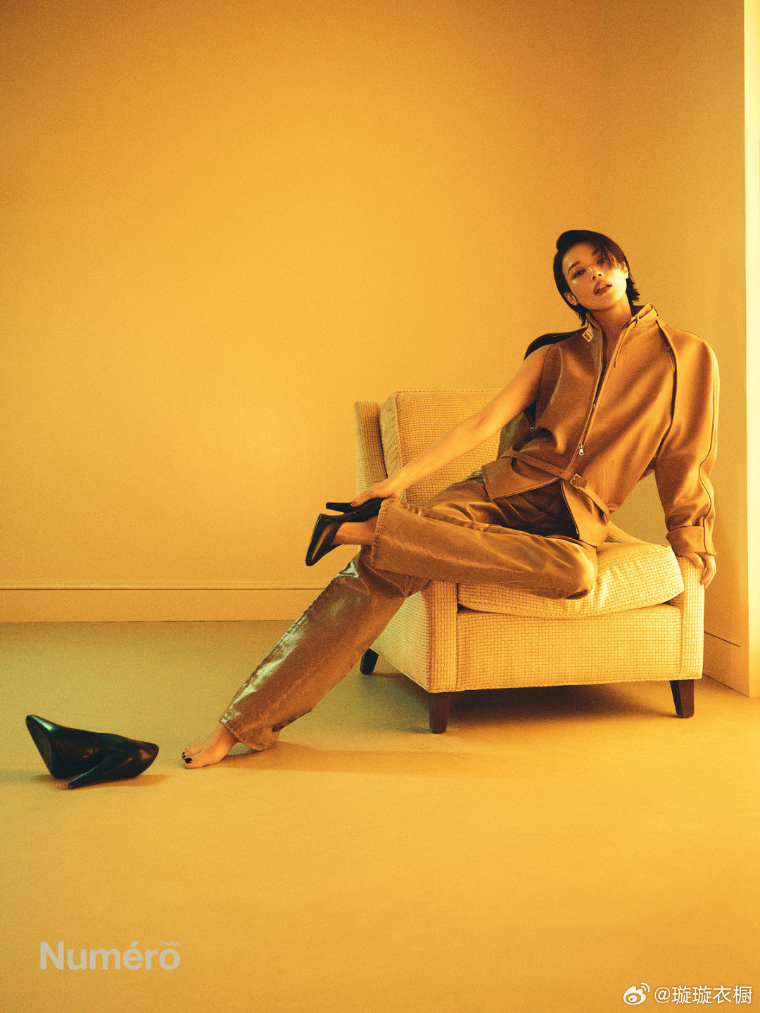 焦糖西装漫不经心滑落肩头,赤足轻点地面,像踩碎了一捧流动的琥珀。墨镜后的眼神藏着星辰,鹦鹉翅膀掠过黑色裙摆,是自由与优雅的共舞。舒淇Numero新刊封面舒淇齐耳短发