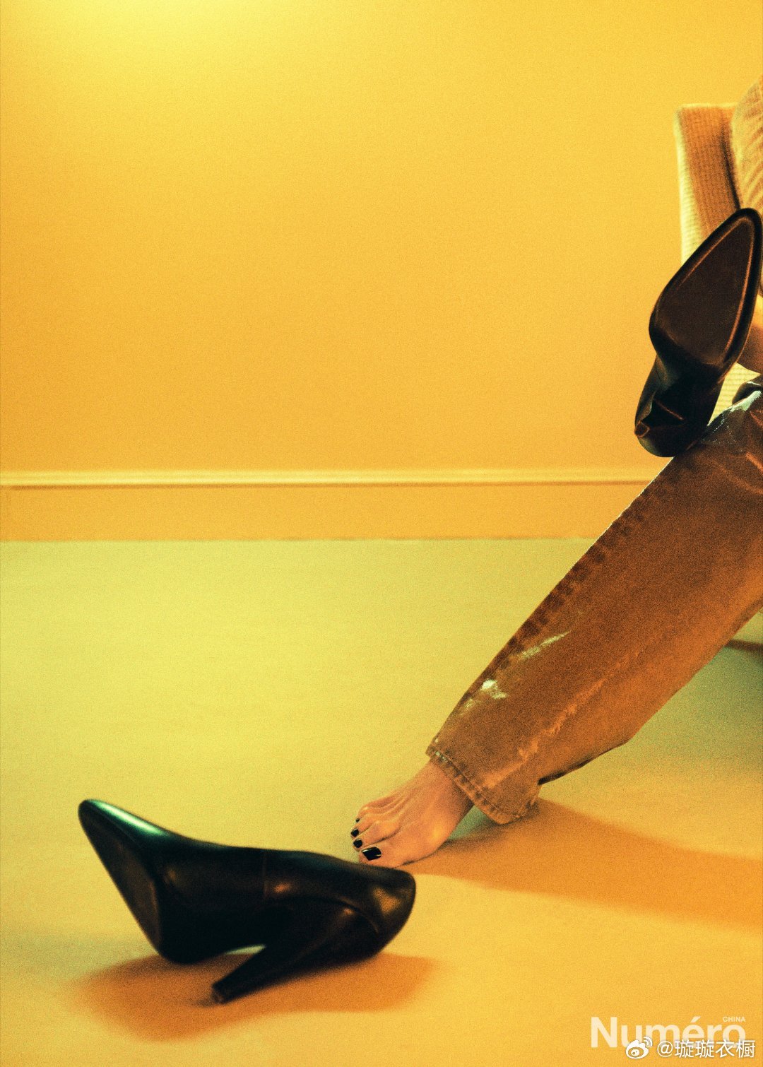 焦糖西装漫不经心滑落肩头,赤足轻点地面,像踩碎了一捧流动的琥珀。墨镜后的眼神藏着