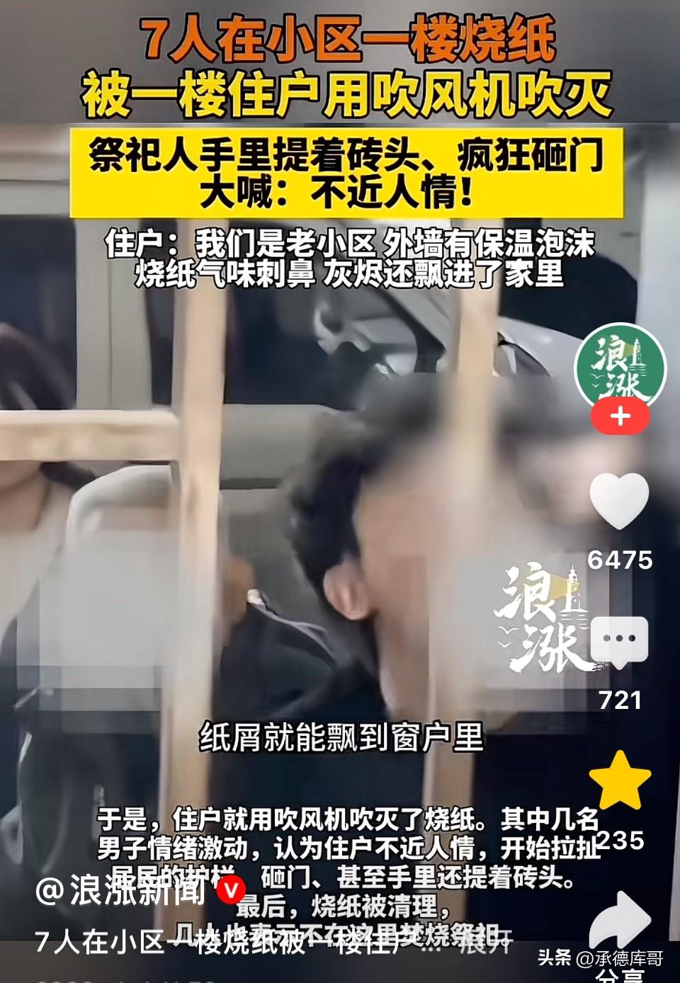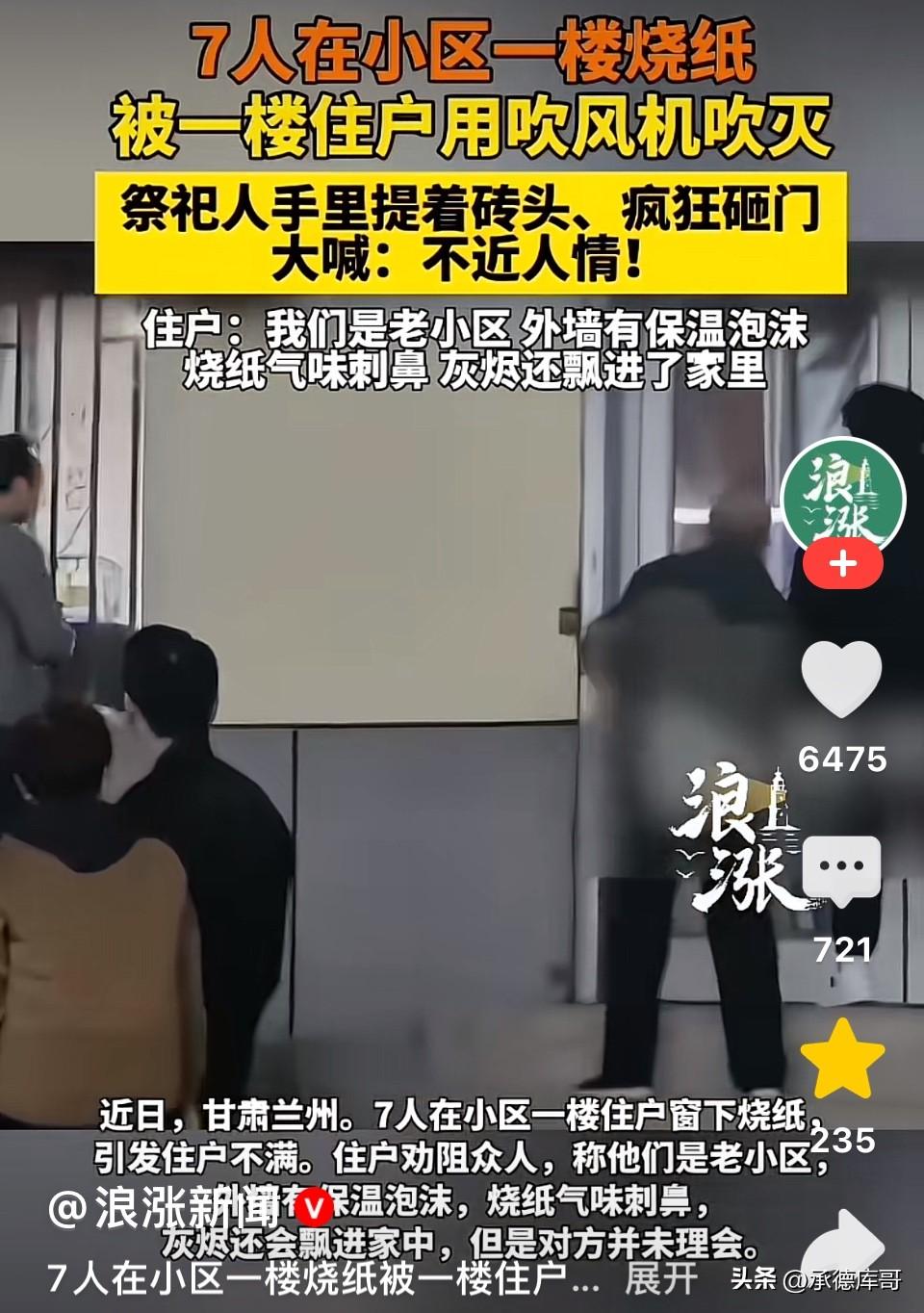 太嚣张!甘肃兰州,7人在老旧小区一楼住户窗下祭祀烧纸,住户出来劝阻,可是对方根本不听,无奈住户用吹风机将纸吹灭,可是对方觉得住户太不近人情,上前拉扯窗户护栏并砸门。 兰州一个老旧小区内,一家7个人在一楼住户窗外墙根处烧纸祭祀。 外面的声响和刺鼻的气味很快就惊动了住户。 住户一看有人在自己家窗前烧纸赶紧上前劝阻提示:房子外墙保温层易燃,浓烟还往屋里灌。纸灰也会飞进屋子,让他们不要在这里烧。 结果呢?人家不听,继续烧。住户无奈,拿出吹风机把火吹灭了。 这下捅了马蜂窝。 几名男子当场急眼,认为住户“太不近人情”。纷纷冲上前扯护栏、砸屋门,有人还抄起了砖头。对住户是大喊大叫:你出来,这里是公共场所,你凭什么不让我们烧纸!出来你给我出来….. 住户见对方人数众多,情绪激动,只能躲在屋里不敢出来。 录了视频发到网上,想让大家评评理。 有的网友说,扯蛋,烧纸最多会有纸屑,不会有其他的。这是对先人的一种怀念中国几千年的祭祀文化。 也有的说,活久见头一次见到在小区烧纸,都在十字路口烧。 还有的说,在别人窗户外烧,太不道德了吧! 看到这里,我只想说一句:谁不近人情?谁给你的勇气? 住户的诉求过分吗?一点都不过分。老旧小区的外墙保温材料,不少都是易燃材质,一旦起火,整栋楼都可能遭殃。而且浓烟往家里灌,换了谁都受不了。劝阻无效后,用吹风机灭火,已经是相当克制的方式了。 反倒是这几个人,烧纸祭祖本可以理解,但祭奠先人,不能成为漠视公共安全的挡箭牌。 更荒唐的是,火灭了之后,他们不是反思,而是集体暴怒,甚至升级到打砸、威胁的程度。这哪里是祭奠?分明是耍横。 在居民楼下,随意焚烧纸钱冥物,本身就涉嫌违反消防法规和城市管理规定。住户劝阻是正当维权,吹灭火源是消除隐患。而拉拽护栏、砸门、持砖威胁,轻了说是寻衅滋事,重了说已经涉嫌违法甚至犯罪。 谁“不近人情”?真正不近人情的,是那些把个人习俗凌驾于他人安全之上,还用暴力回应劝阻的人。 他们可能觉得,烧纸是天经地义的事,你吹灭就是不敬、就是找茬。但他们忘了,你的习俗自由,止于别人的生命安全。 烧纸寄托哀思,本无可厚非。但文明祭祀,不是一句空话——去指定区域、用焚烧桶、注意防火,这些都不难。 难的是,有些人永远觉得“我的事最大,别人都得让着我”。 这事你怎么看?住户吹灭火,到底“不近人情”在哪里?欢迎在评论区聊聊。